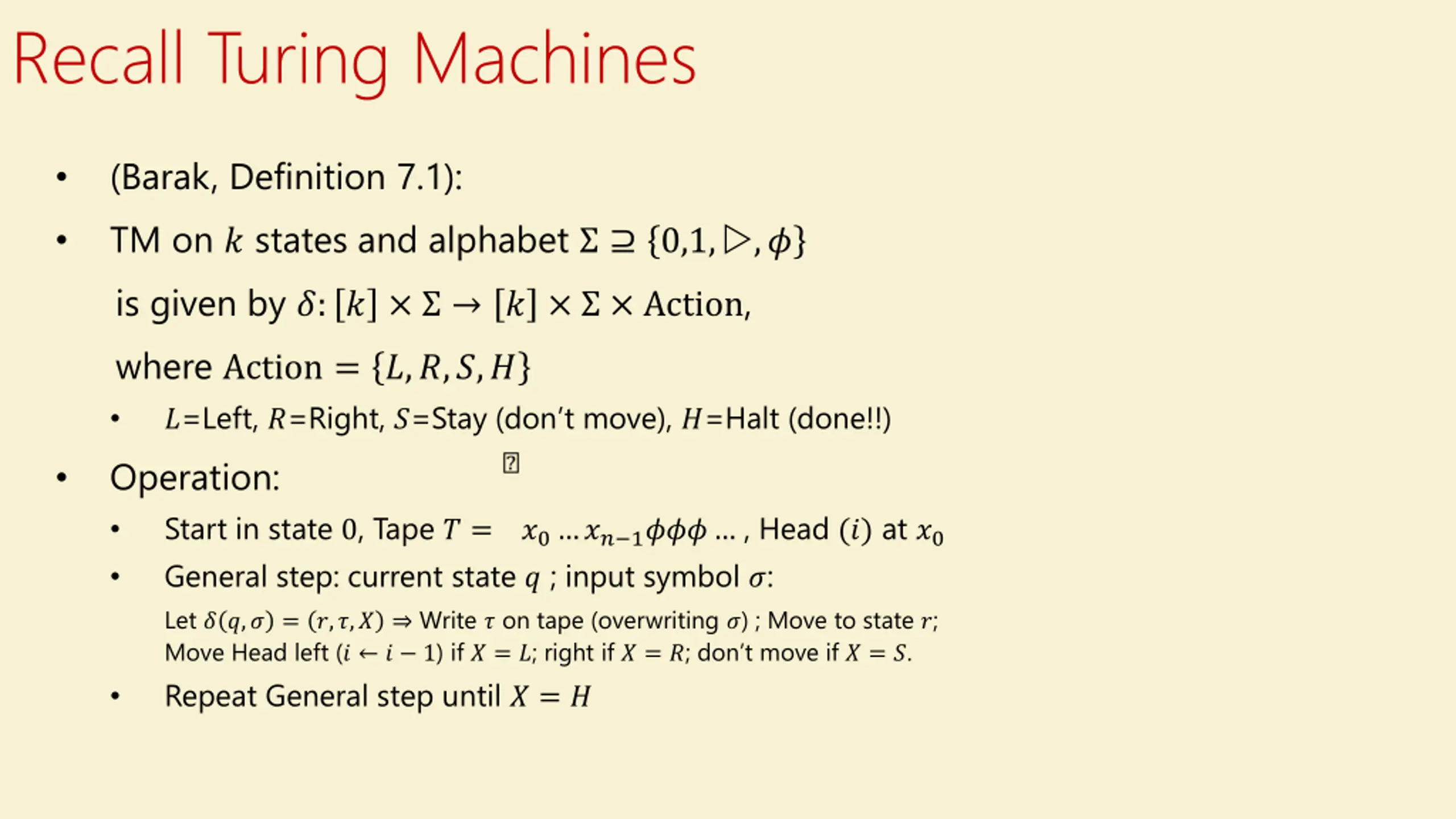 Recall Turing Machines (Barak, Definition 7.1): TM on ? states and alphabet 0,1, ,? is given by ?: ? ? Action, where Action = ?,?,?,? ?=Left, ?=Right, ?=Stay (don t move), ?=Halt (done!!) Operation: Start in state 0, Tape ? = General step: current state ? ; input symbol ?: Let ? ?,? = ?,?,? Write ? on tape (overwriting ?) ; Move to state ?; Move Head left (? ? 1) if ? = ?; right if ? = ?; don t move if ? = ?. Repeat General step until ? = ? ?0 ?? 1??? , Head (?) at ?0