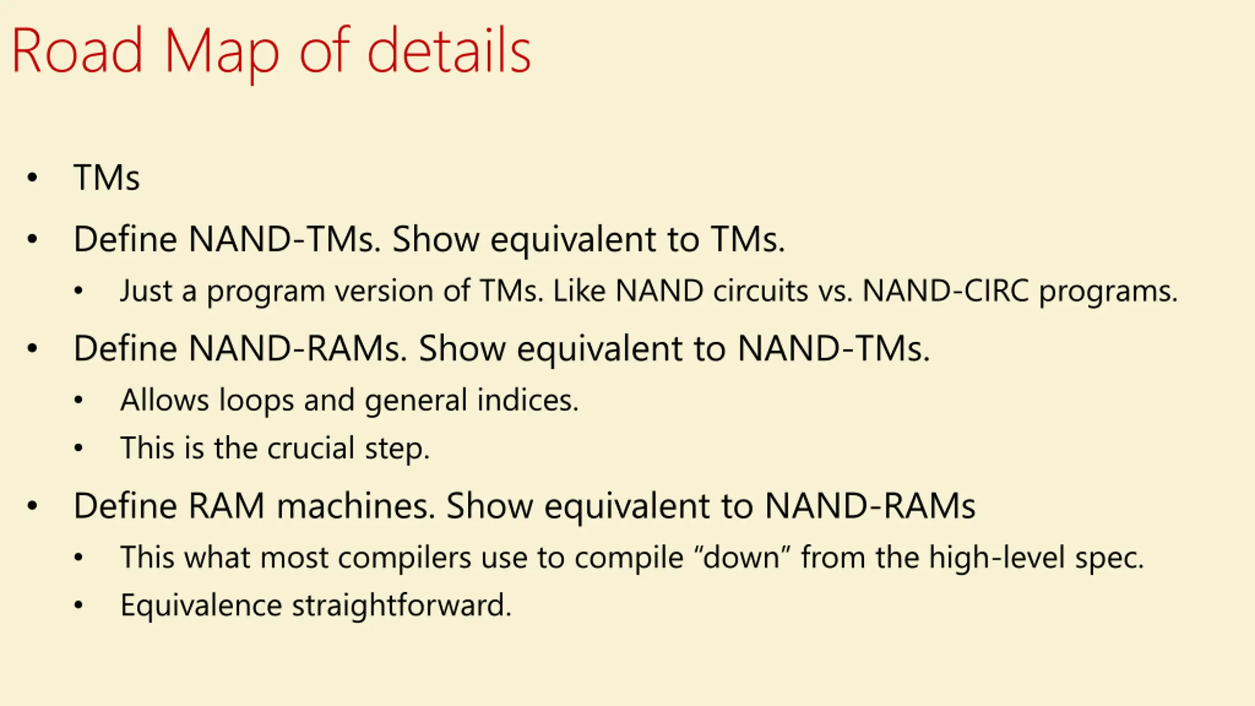 Road Map of details TMs Define NAND-TMs. Show equivalent to TMs. Just a program version of TMs. Like NAND circuits vs. NAND-CIRC programs. Define NAND-RAMs. Show equivalent to NAND-TMs. Allows loops and general indices. This is the crucial step. Define RAM machines. Show equivalent to NAND-RAMs This what most compilers use to compile down from the high-level spec. Equivalence straightforward.
