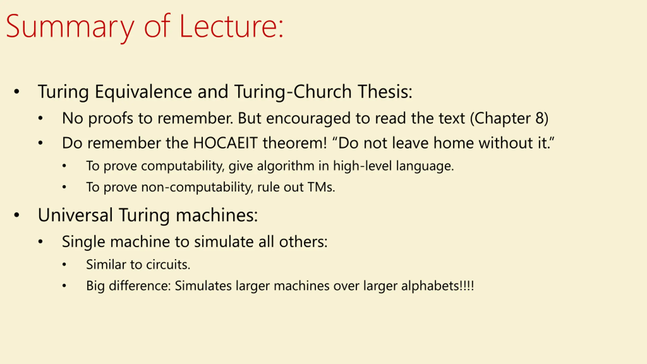 Summary of Lecture: Turing Equivalence and Turing-Church Thesis: No proofs to remember. But encouraged to read the text (Chapter 8) Do remember the HOCAEIT theorem! Do not leave home without it. To prove computability, give algorithm in high-level language. To prove non-computability, rule out TMs. Universal Turing machines: Single machine to simulate all others: Similar to circuits. Big difference: Simulates larger machines over larger alphabets!!!!
