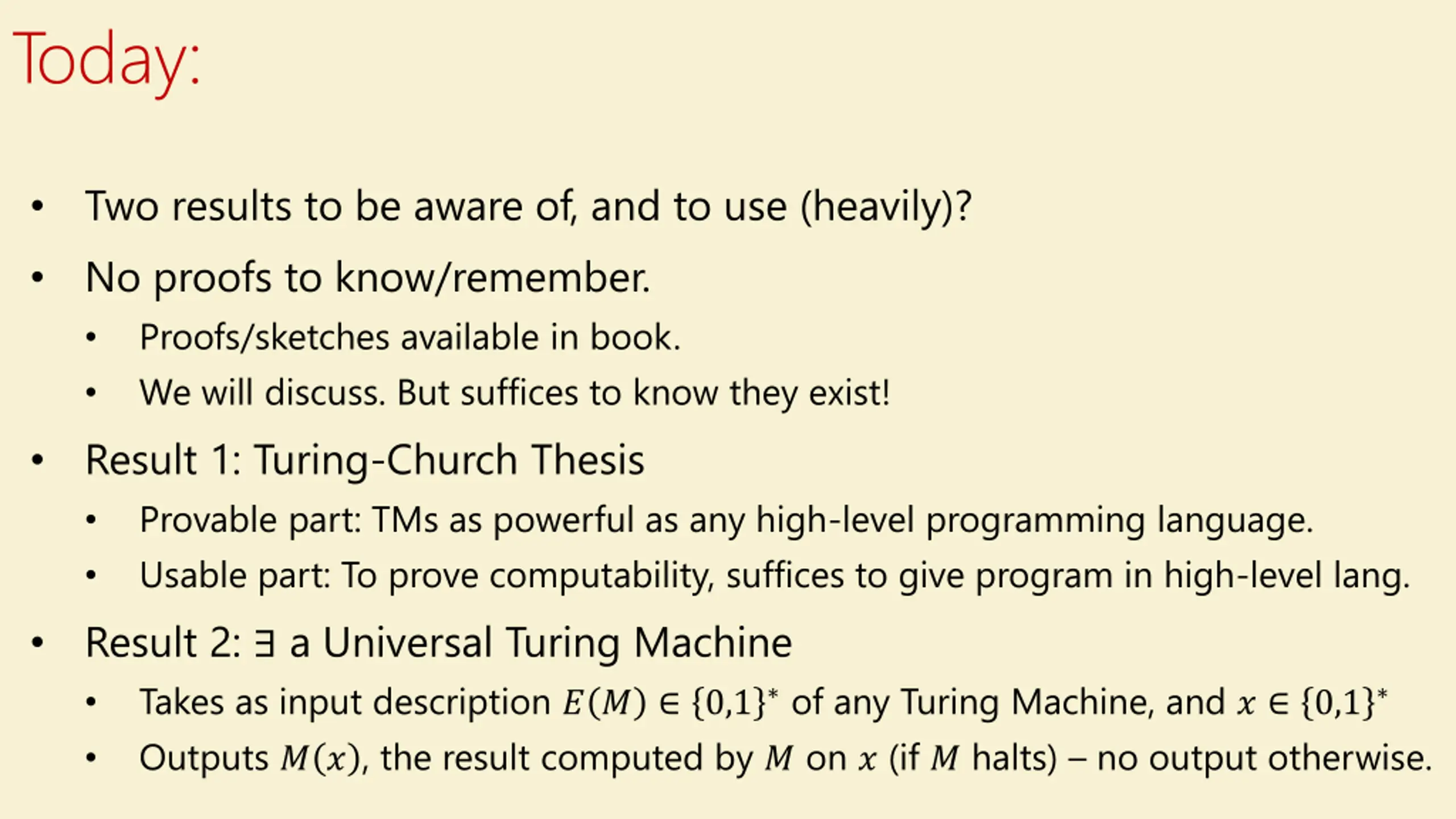 Today: Two results to be aware of, and to use (heavily)? No proofs to know/remember. Proofs/sketches available in book. We will discuss. But suffices to know they exist! Result 1: Turing-Church Thesis Provable part: TMs as powerful as any high-level programming language. Usable part: To prove computability, suffices to give program in high-level lang. Result 2: a Universal Turing Machine Takes as input description ? ? 0,1 of any Turing Machine, and ? 0,1 Outputs ? ? , the result computed by ? on ? (if ? halts) no output otherwise.