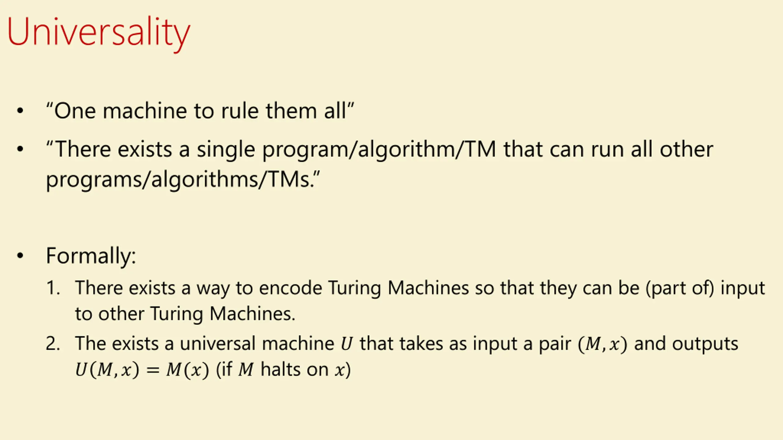 Universality One machine to rule them all There exists a single program/algorithm/TM that can run all other programs/algorithms/TMs. Formally: 1. There exists a way to encode Turing Machines so that they can be (part of) input to other Turing Machines. 2. The exists a universal machine ? that takes as input a pair (?,?) and outputs ? ?,? = ?(?) (if ? halts on ?)