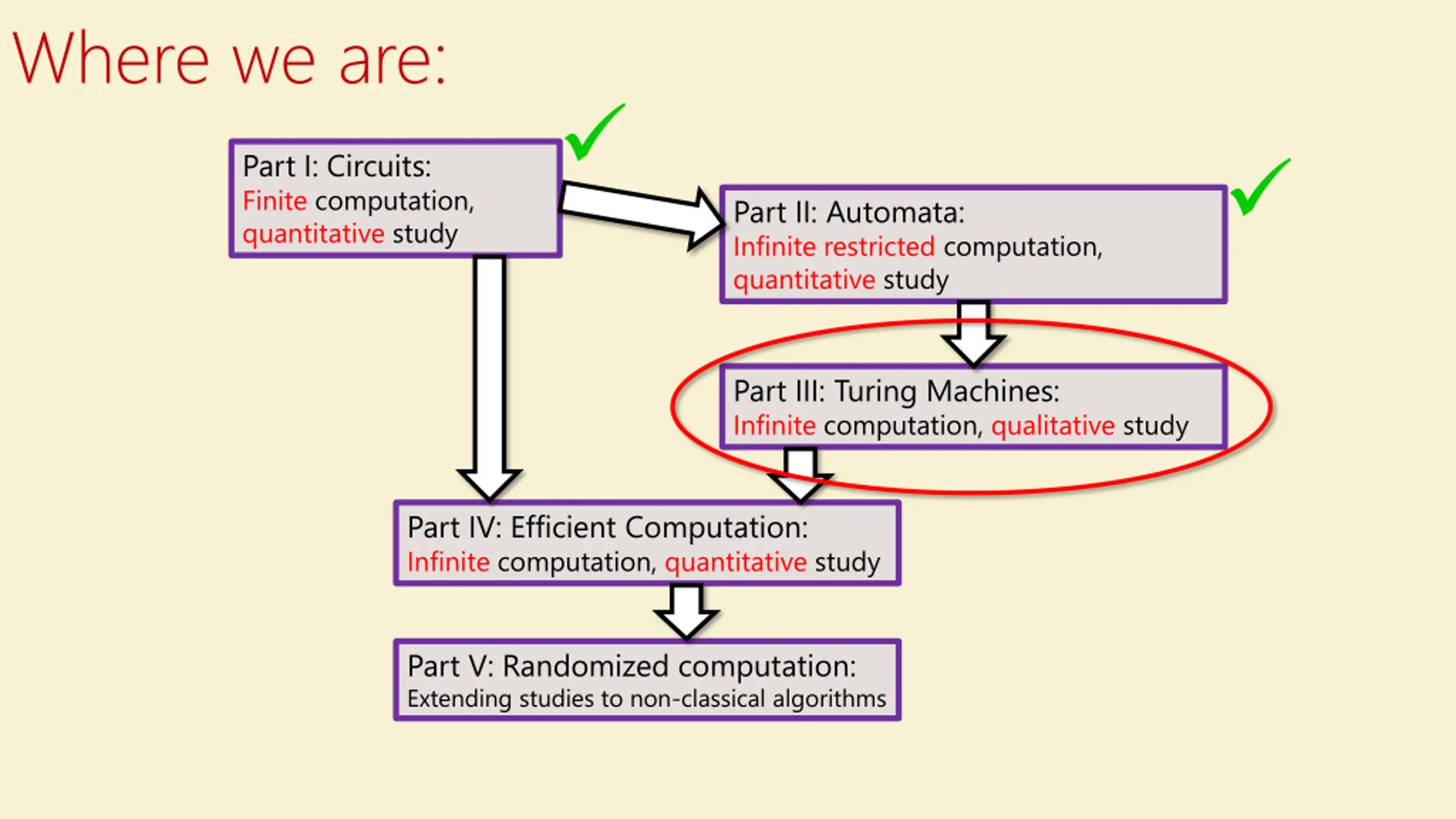 Where we are: Part I: Circuits: Finite computation, quantitative study Part II: Automata: Infinite restricted computation, quantitative study Part III: Turing Machines: Infinite computation, qualitative study Part IV: Efficient Computation: Infinite computation, quantitative study Part V: Randomized computation: Extending studies to non-classical algorithms