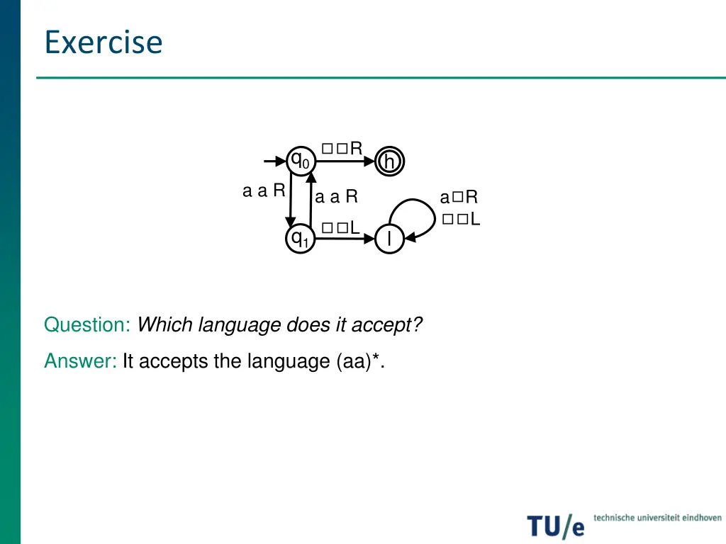 Exercise R q0 h a a R a a R a R L L q1 l Question: Which language does it accept? Answer: It accepts the language (aa)*.
