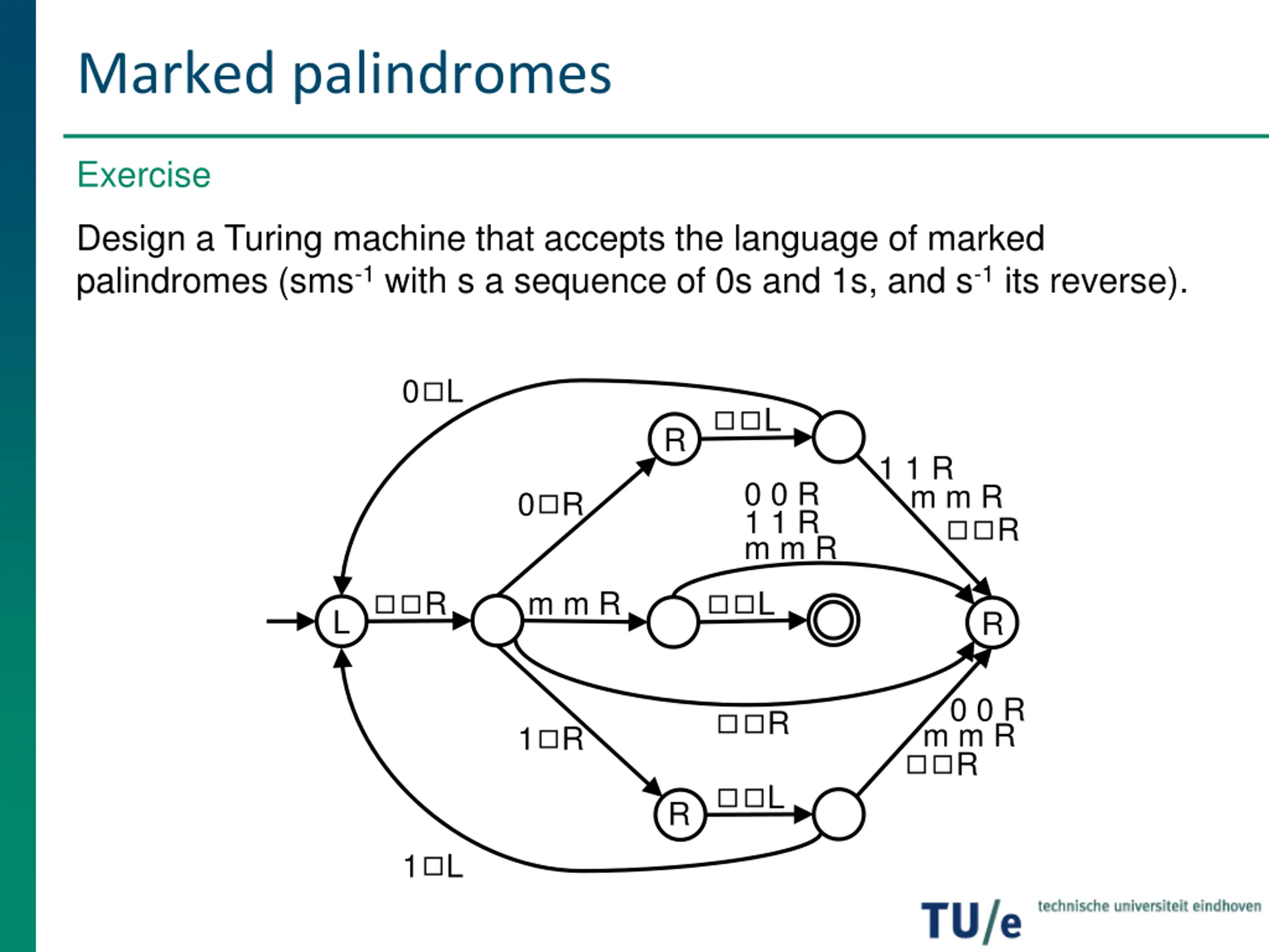 Marked palindromes Exercise Design a Turing machine that accepts the language of marked palindromes (sms-1 with s a sequence of 0s and 1s, and s-1 its reverse). 0 L L R 1 1 R 0 0 R m m R 0 R 1 1 R R m m R R m m R L L R 0 0 R m m R R R 1 R L R 1 L