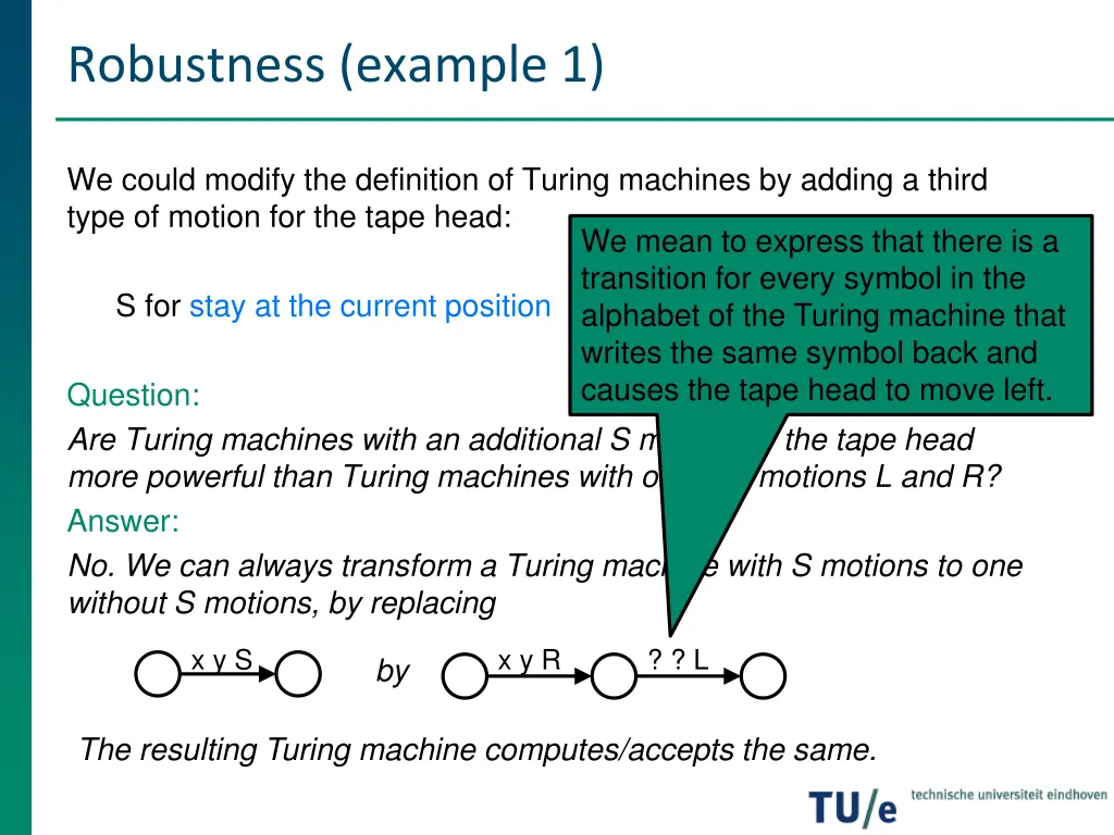 Robustness (example 1) We could modify the definition of Turing machines by adding a third type of motion for the tape head: We mean to express that there is a transition for every symbol in the alphabet of the Turing machine that writes the same symbol back and causes the tape head to move left. S for stay at the current position Question: Are Turing machines with an additional S motion for the tape head more powerful than Turing machines with only the motions L and R? Answer: No. We can always transform a Turing machine with S motions to one without S motions, by replacing x y S x y R ? ? L by The resulting Turing machine computes/accepts the same.
