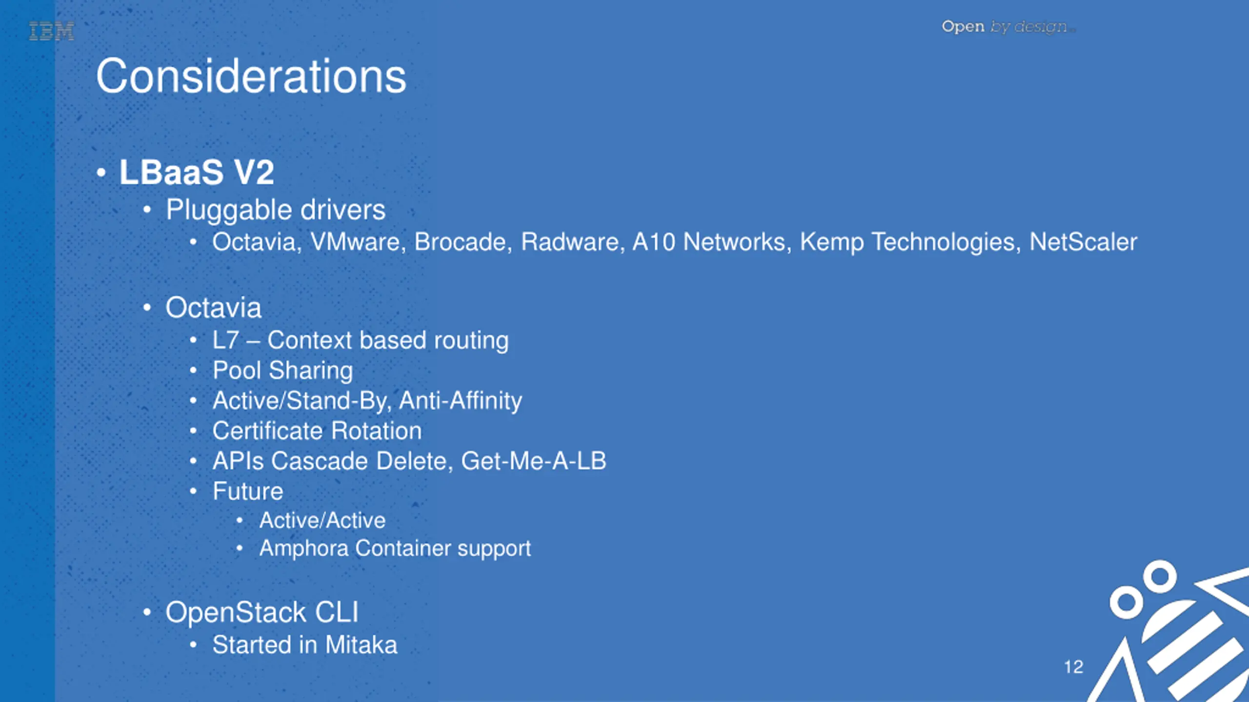 Considerations LBaaS V2 Pluggable drivers Octavia, VMware, Brocade, Radware, A10 Networks, Kemp Technologies, NetScaler Octavia L7 Context based routing Pool Sharing Active/Stand-By, Anti-Affinity Certificate Rotation APIs Cascade Delete, Get-Me-A-LB Future Active/Active Amphora Container support OpenStack CLI Started in Mitaka 12