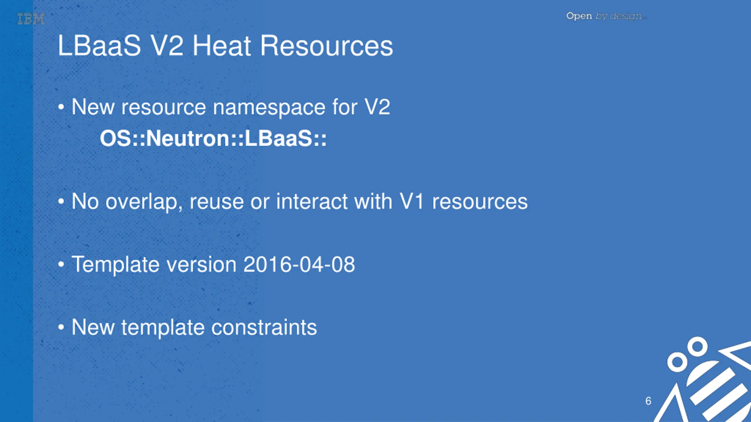 LBaaS V2 Heat Resources New resource namespace for V2 OS::Neutron::LBaaS:: No overlap, reuse or interact with V1 resources Template version 2016-04-08 New template constraints 6