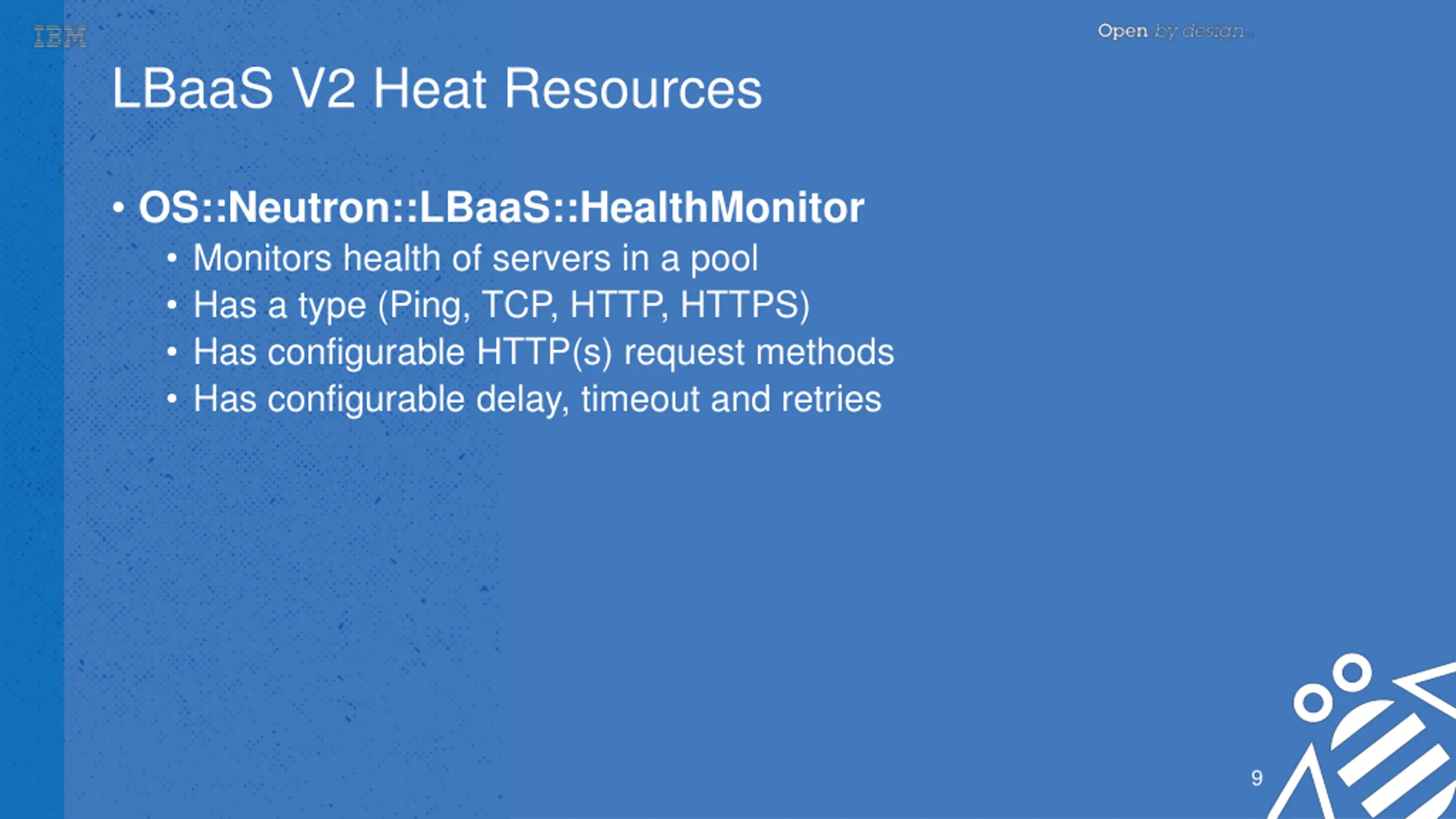 LBaaS V2 Heat Resources OS::Neutron::LBaaS::HealthMonitor Monitors health of servers in a pool Has a type (Ping, TCP, HTTP, HTTPS) Has configurable HTTP(s) request methods Has configurable delay, timeout and retries 9