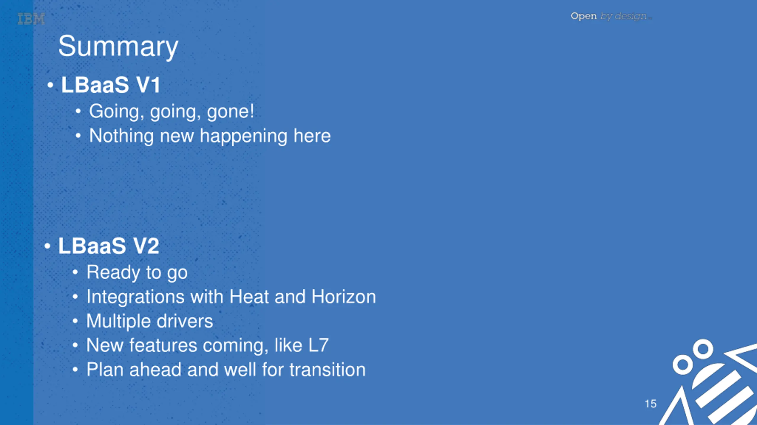 Summary LBaaS V1 Going, going, gone! Nothing new happening here LBaaS V2 Ready to go Integrations with Heat and Horizon Multiple drivers New features coming, like L7 Plan ahead and well for transition 15