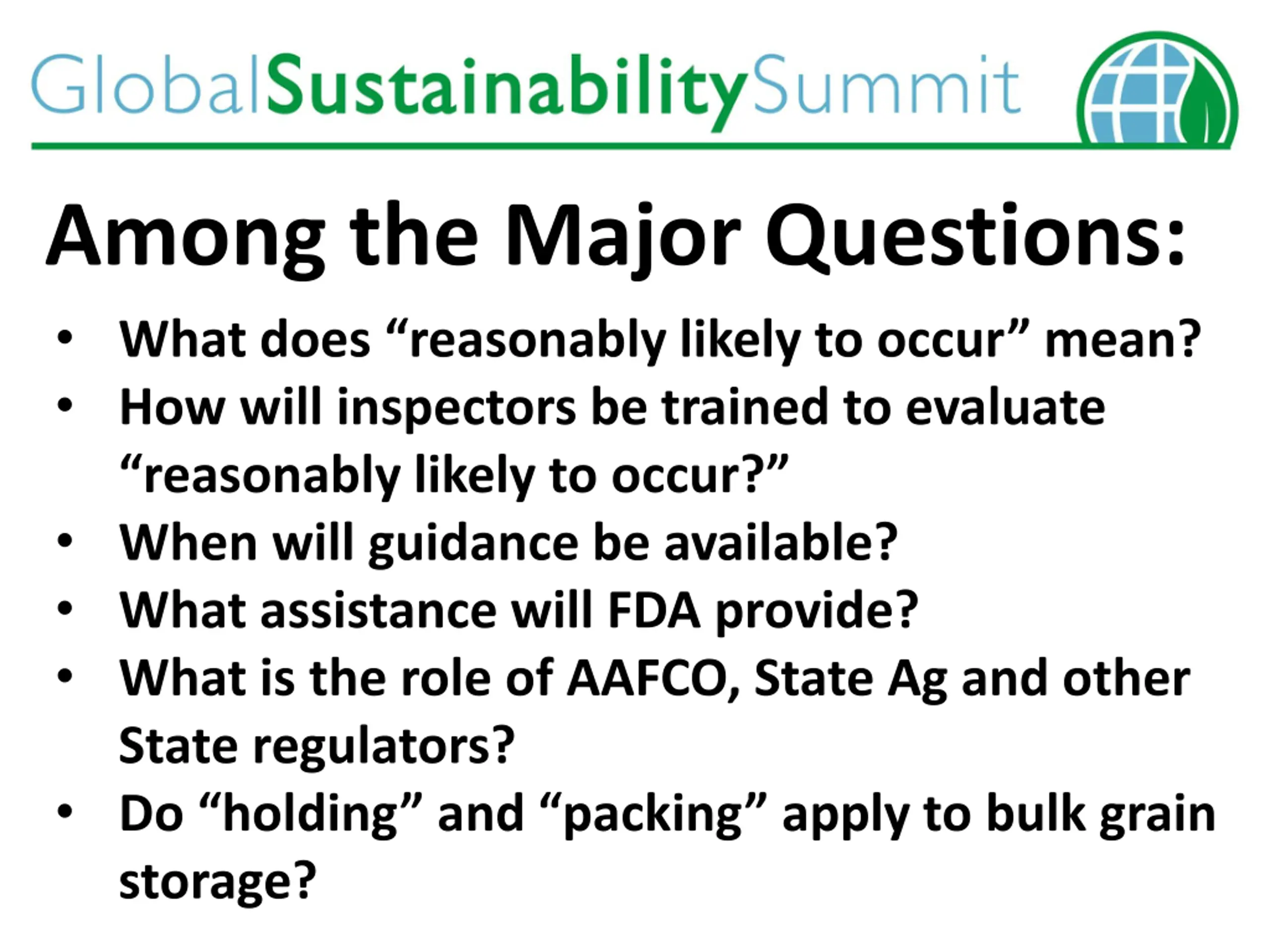 Among the Major Questions: What does reasonably likely to occur mean? How will inspectors be trained to evaluate reasonably likely to occur? When will guidance be available? What assistance will FDA provide? What is the role of AAFCO, State Ag and other State regulators? Do holding and packing apply to bulk grain storage?