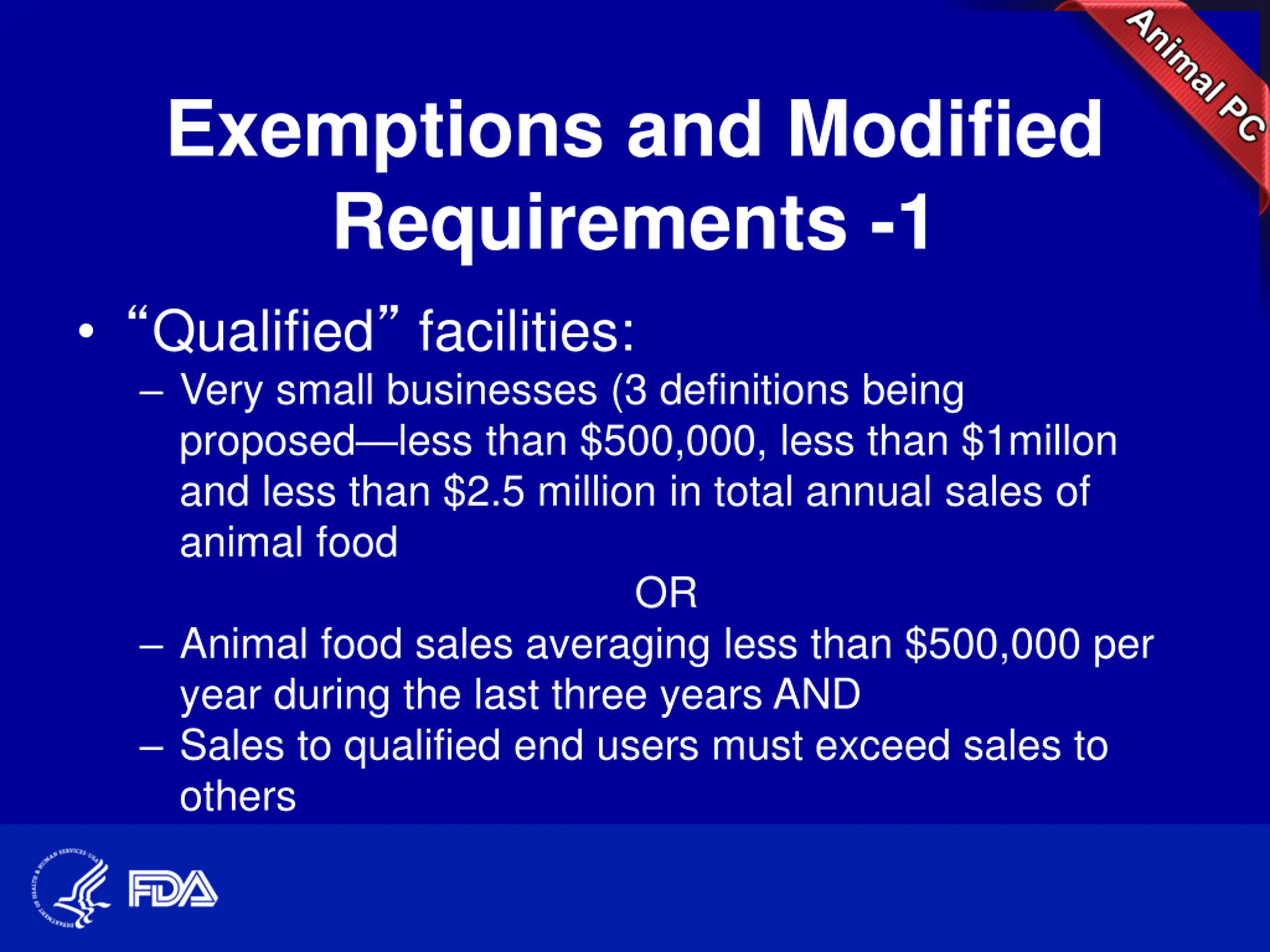 Exemptions and Modified Requirements -1 Qualified facilities: Very small businesses (3 definitions being proposed less than $500,000, less than $1millon and less than $2.5 million in total annual sales of animal food OR Animal food sales averaging less than $500,000 per year during the last three years AND Sales to qualified end users must exceed sales to others