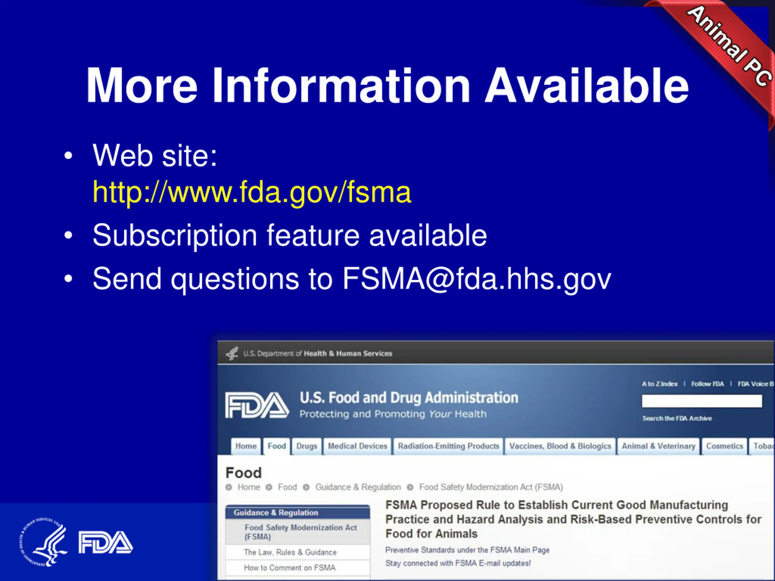 More Information Available Web site: http://www.fda.gov/fsma Subscription feature available Send questions to FSMA@fda.hhs.gov