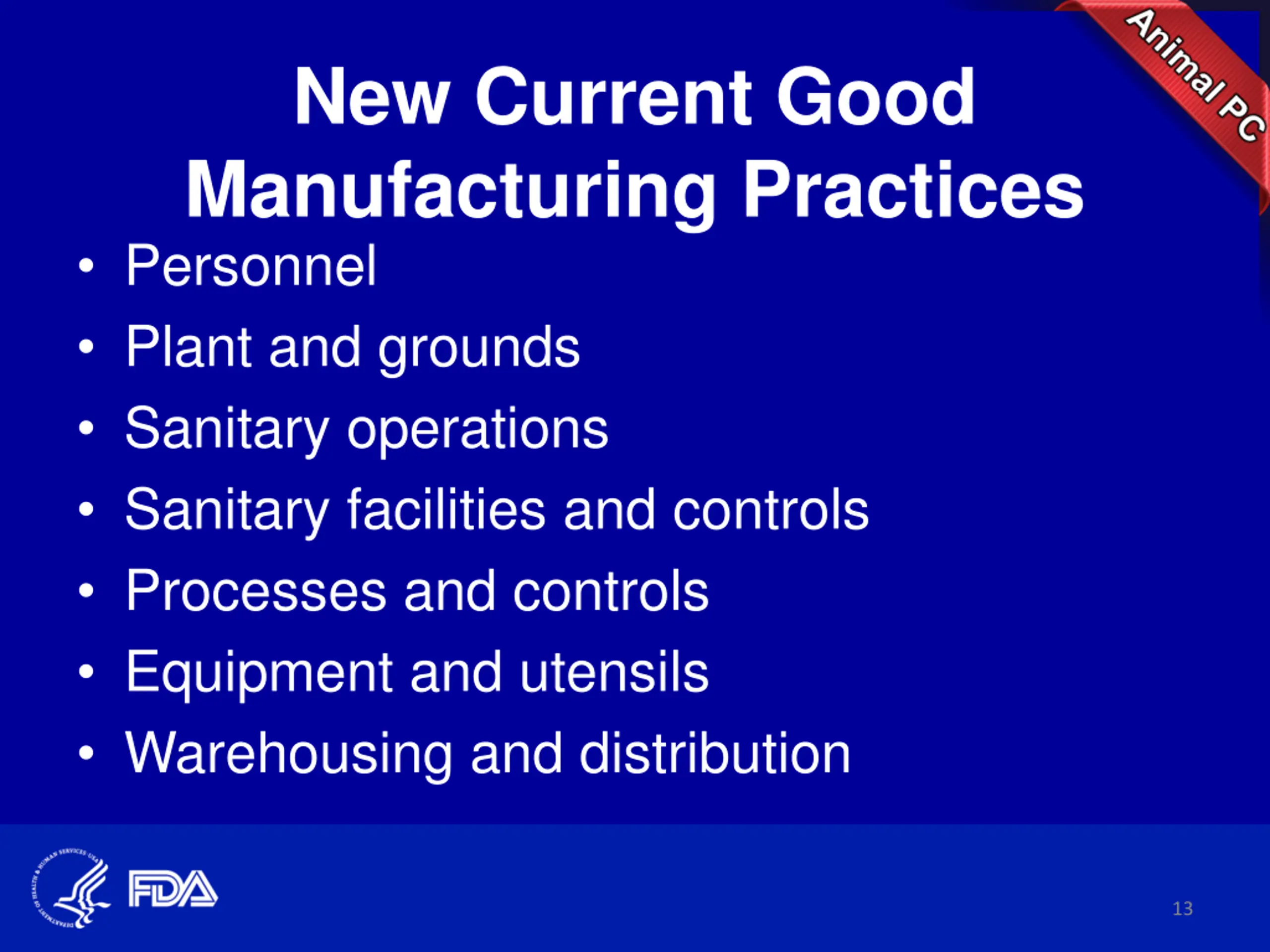 New Current Good Manufacturing Practices Personnel Plant and grounds Sanitary operations Sanitary facilities and controls Processes and controls Equipment and utensils Warehousing and distribution 13