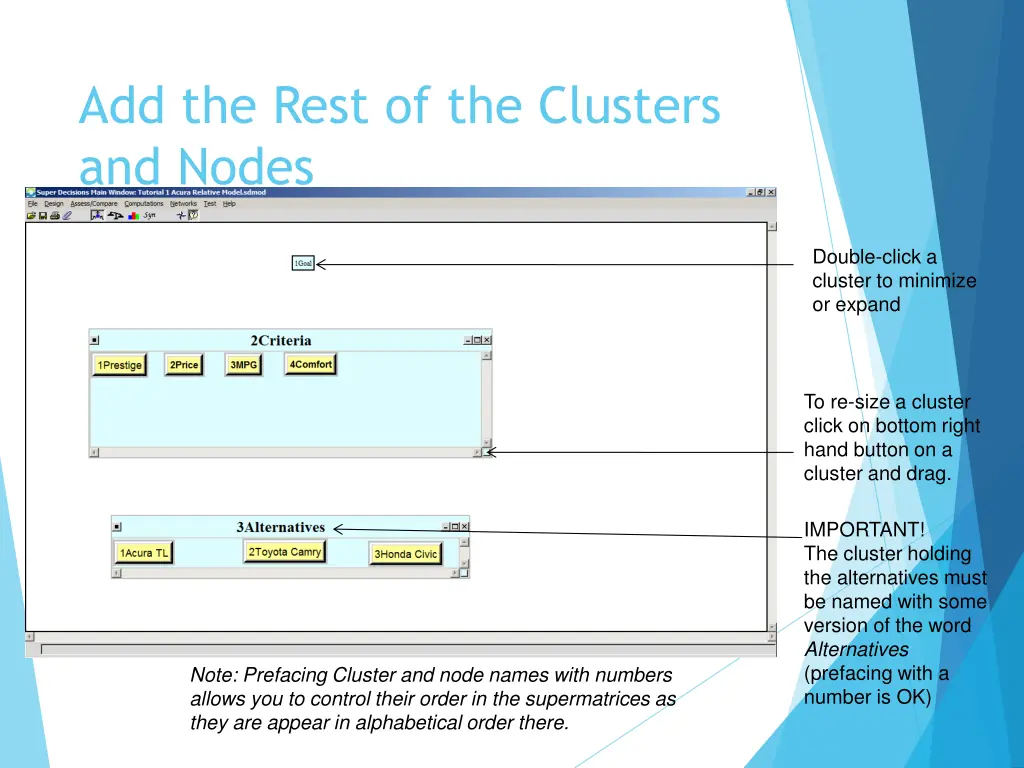The Decision Hierarchy as it appears in the SuperDecisions Software Cluster Node All links are among nodes: the cluster link is automatically created because some node(s) in the Criteria cluster are connected to some node(s) in the Alternatives cluster See the SuperDecisions software model: Tutorial_1_Acura_Relative_Model.sdmod