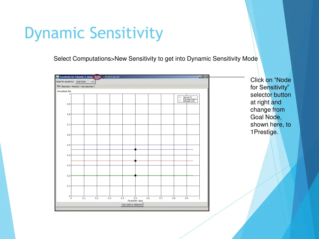 Dynamic Sensitivity Select Computations>New Sensitivity to get into Dynamic Sensitivity Mode Click on Node for Sensitivity selector button at right and change from Goal Node, shown here, to 1Prestige.