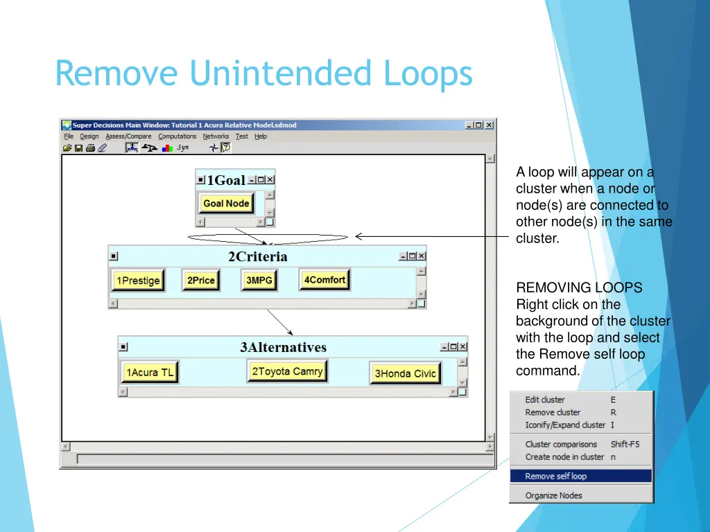 Remove Unintended Loops A loop will appear on a cluster when a node or node(s) are connected to other node(s) in the same cluster. REMOVING LOOPS Right click on the background of the cluster with the loop and select the Remove self loop command.