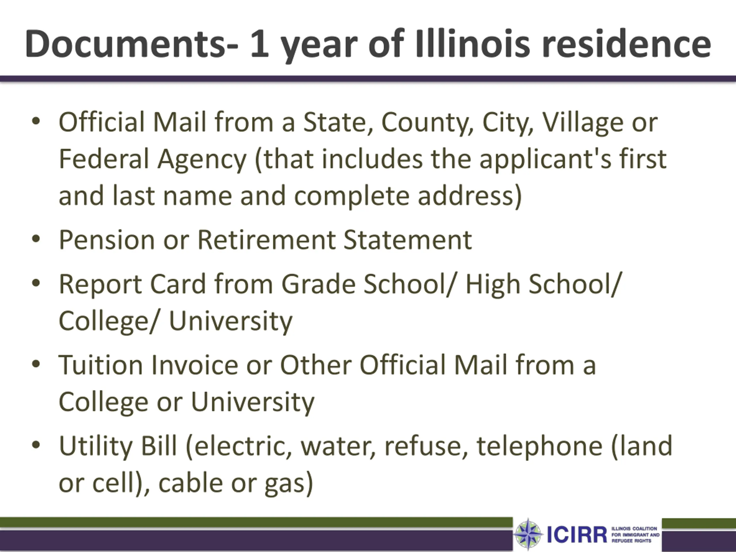 Documents- 1 year of Illinois residence Official Mail from a State, County, City, Village or Federal Agency (that includes the applicant's first and last name and complete address) Pension or Retirement Statement Report Card from Grade School/ High School/ College/ University Tuition Invoice or Other Official Mail from a College or University Utility Bill (electric, water, refuse, telephone (land or cell), cable or gas)