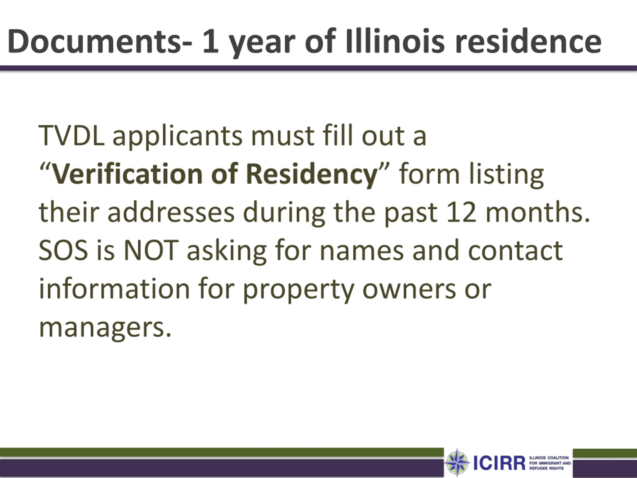 Documents- 1 year of Illinois residence TVDL applicants must fill out a Verification of Residency form listing their addresses during the past 12 months. SOS is NOT asking for names and contact information for property owners or managers.