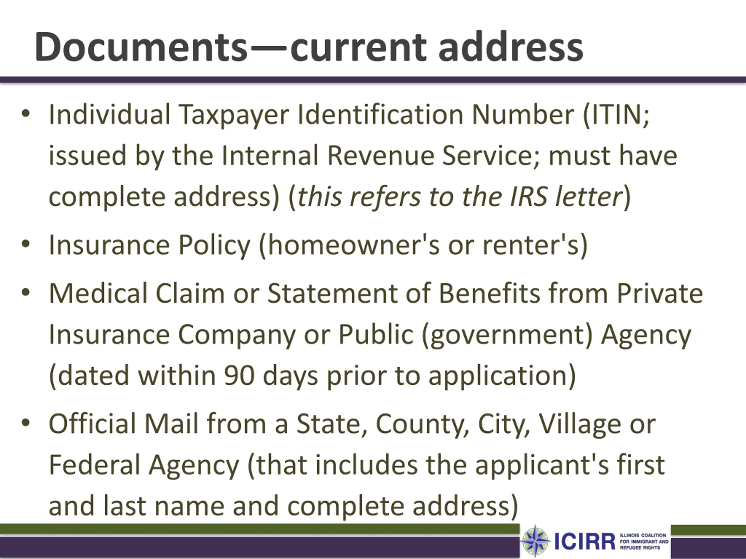 Documentscurrent address Individual Taxpayer Identification Number (ITIN; issued by the Internal Revenue Service; must have complete address) (this refers to the IRS letter) Insurance Policy (homeowner's or renter's) Medical Claim or Statement of Benefits from Private Insurance Company or Public (government) Agency (dated within 90 days prior to application) Official Mail from a State, County, City, Village or Federal Agency (that includes the applicant's first and last name and complete address)