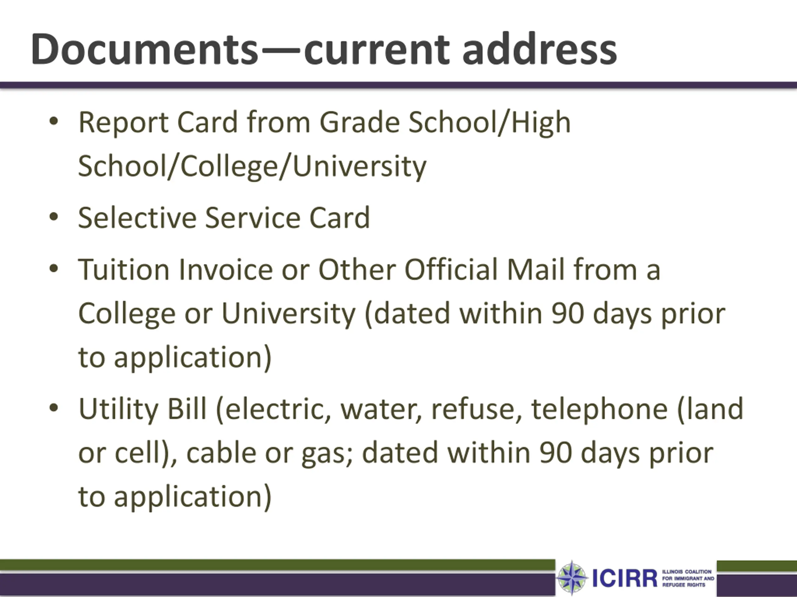 Documentscurrent address Report Card from Grade School/High School/College/University Selective Service Card Tuition Invoice or Other Official Mail from a College or University (dated within 90 days prior to application) Utility Bill (electric, water, refuse, telephone (land or cell), cable or gas; dated within 90 days prior to application)