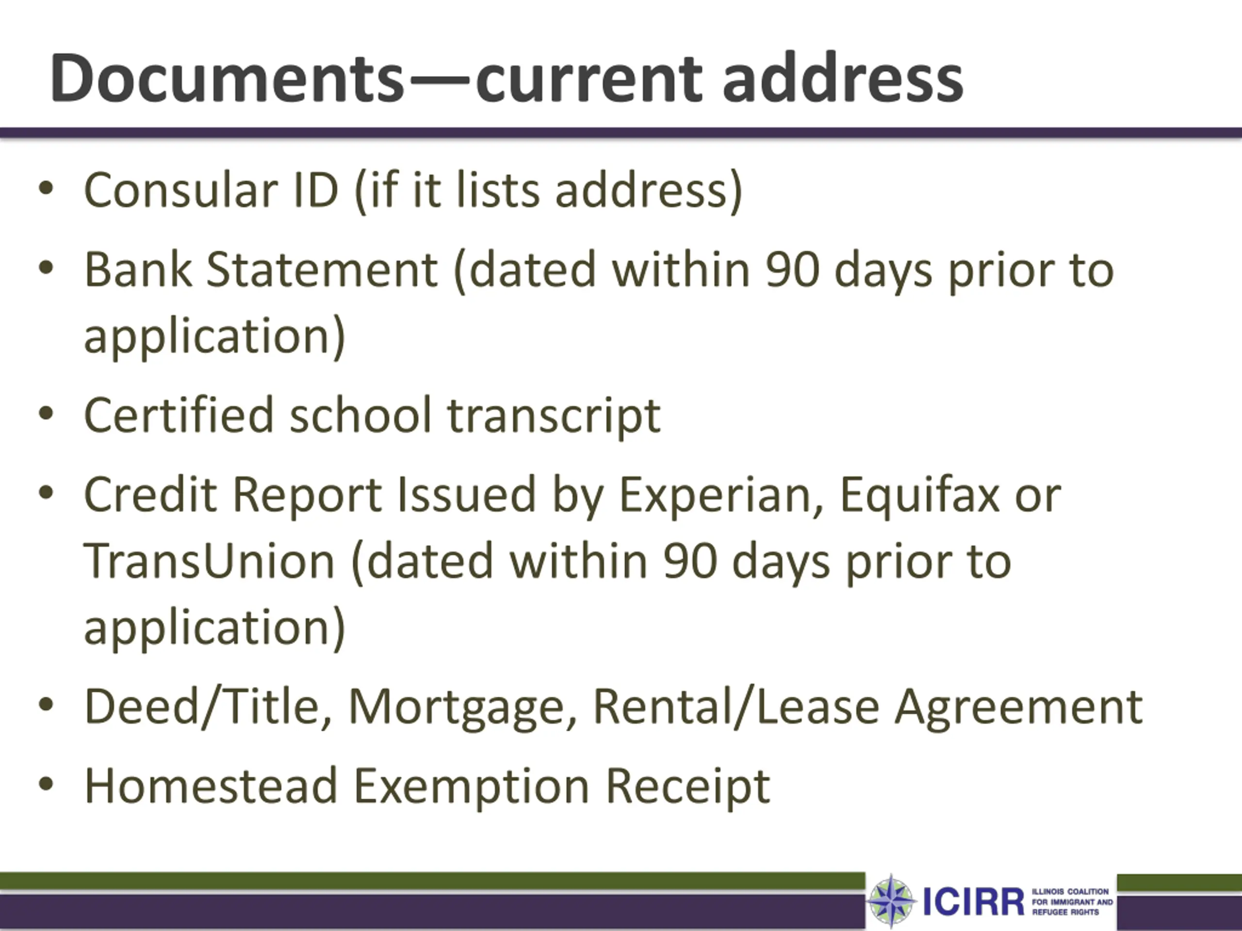 Documentscurrent address Consular ID (if it lists address) Bank Statement (dated within 90 days prior to application) Certified school transcript Credit Report Issued by Experian, Equifax or TransUnion (dated within 90 days prior to application) Deed/Title, Mortgage, Rental/Lease Agreement Homestead Exemption Receipt