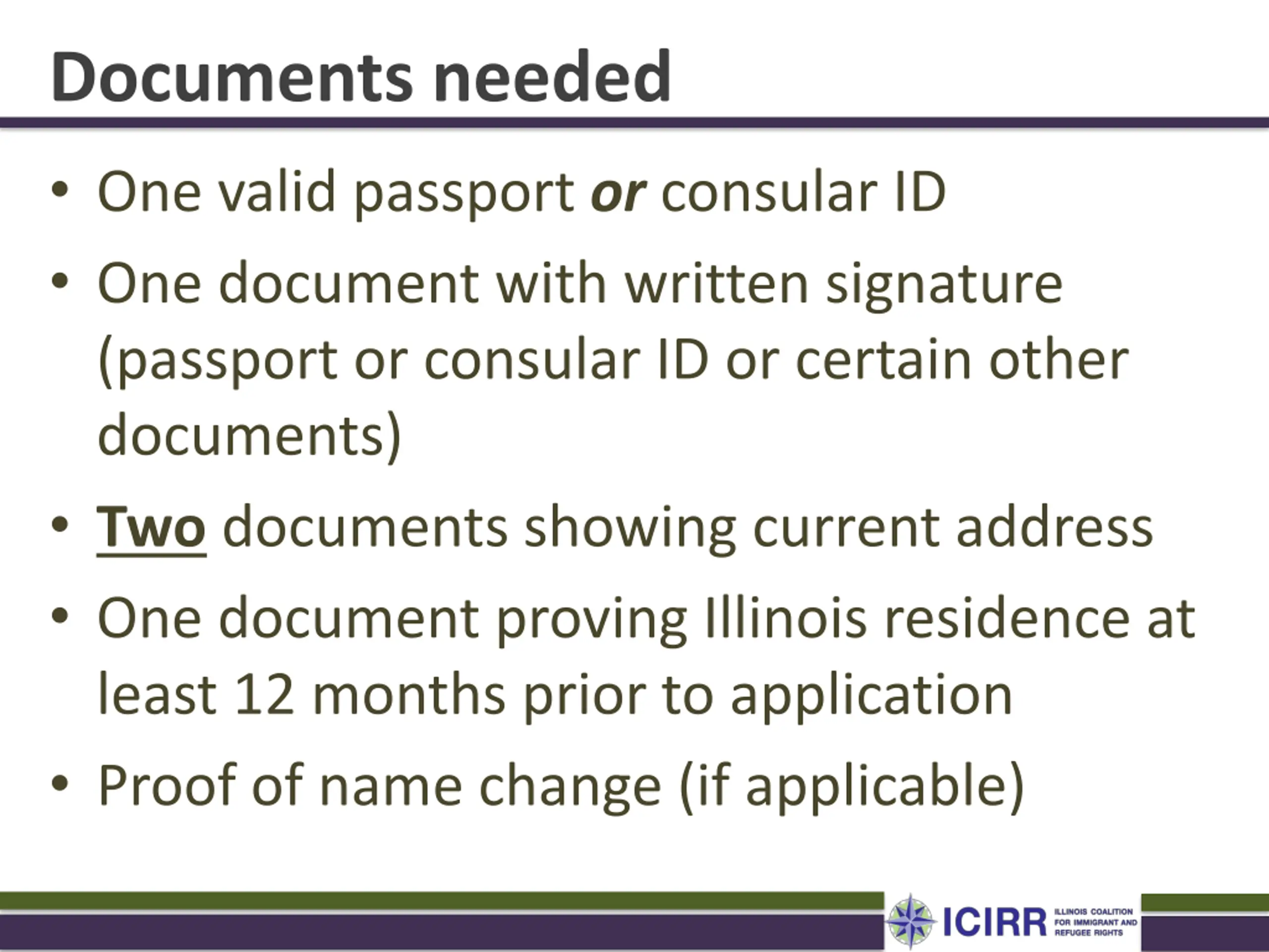 Documents needed One valid passport or consular ID One document with written signature (passport or consular ID or certain other documents) Two documents showing current address One document proving Illinois residence at least 12 months prior to application Proof of name change (if applicable)
