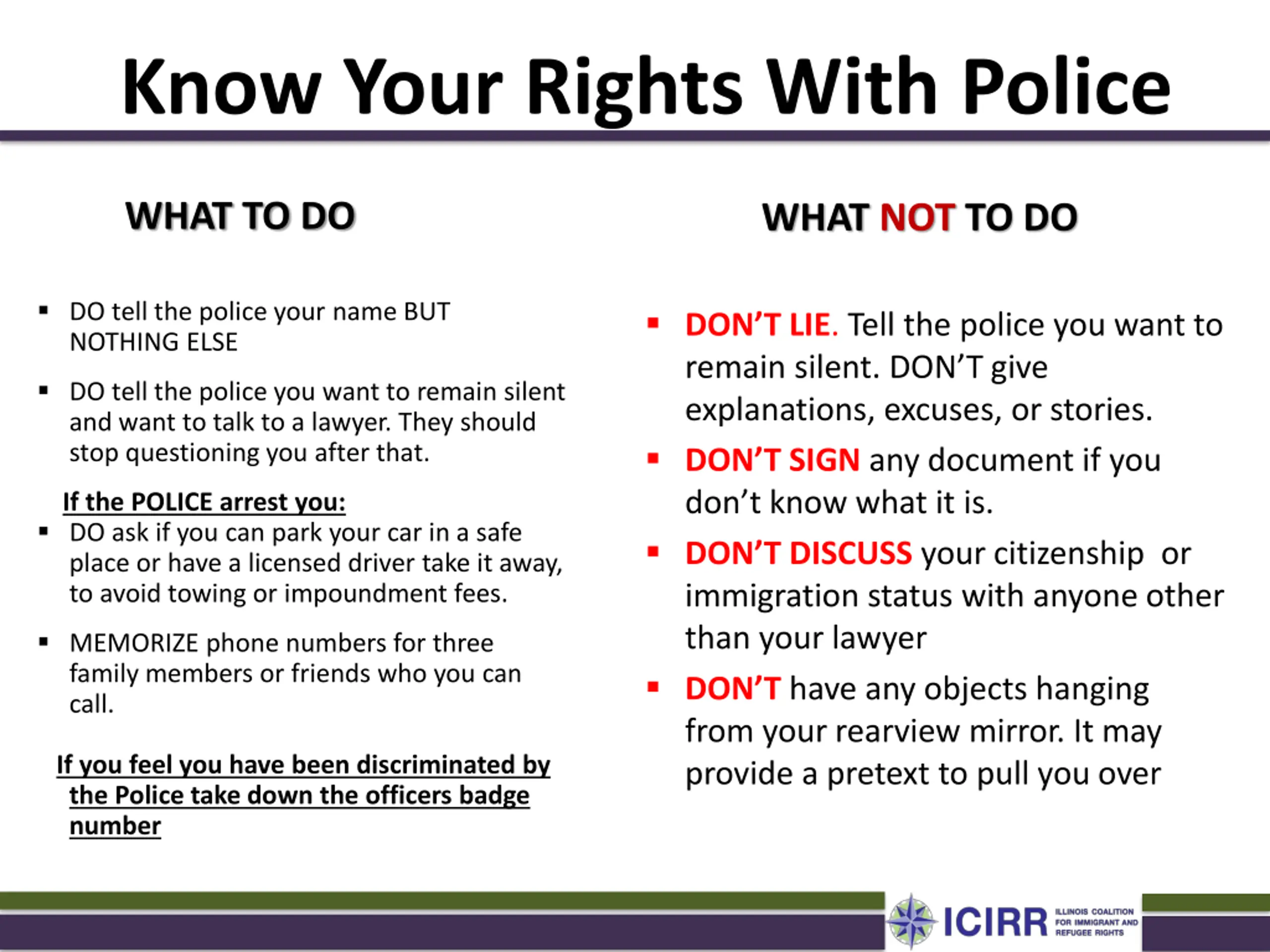 Know Your Rights With Police WHAT TO DO WHAT NOT TO DO DO tell the police your name BUT NOTHING ELSE DON T LIE. Tell the police you want to remain silent. DON T give explanations, excuses, or stories. DON T SIGN any document if you don t know what it is. DON T DISCUSS your citizenship or immigration status with anyone other than your lawyer DON Thave any objects hanging from your rearview mirror. It may provide a pretext to pull you over DO tell the police you want to remain silent and want to talk to a lawyer. They should stop questioning you after that. If the POLICE arrest you: DO ask if you can park your car in a safe place or have a licensed driver take it away, to avoid towing or impoundment fees. MEMORIZE phone numbers for three family members or friends who you can call. If you feel you have been discriminated by the Police take down the officers badge number