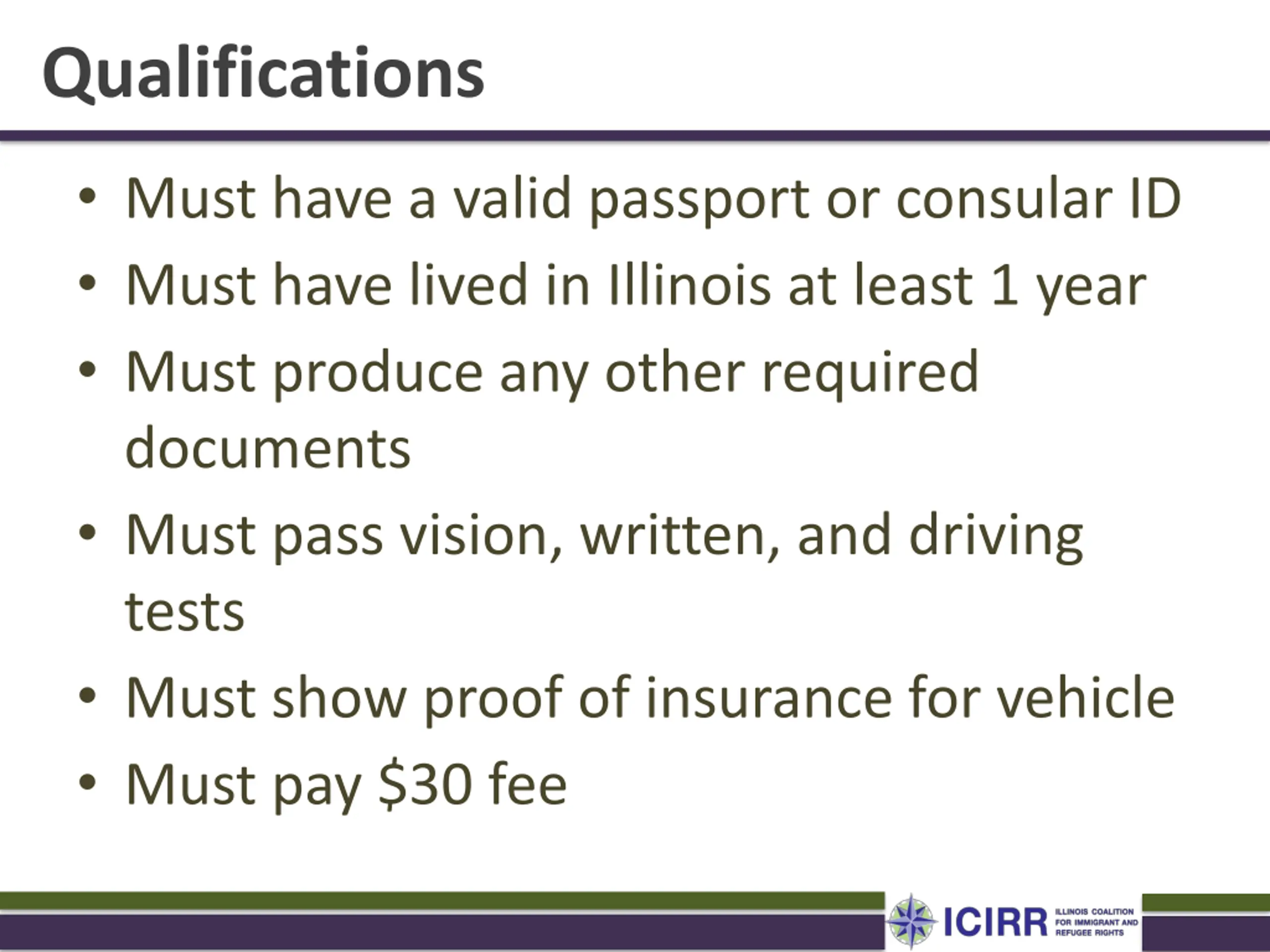Qualifications Must have a valid passport or consular ID Must have lived in Illinois at least 1 year Must produce any other required documents Must pass vision, written, and driving tests Must show proof of insurance for vehicle Must pay $30 fee