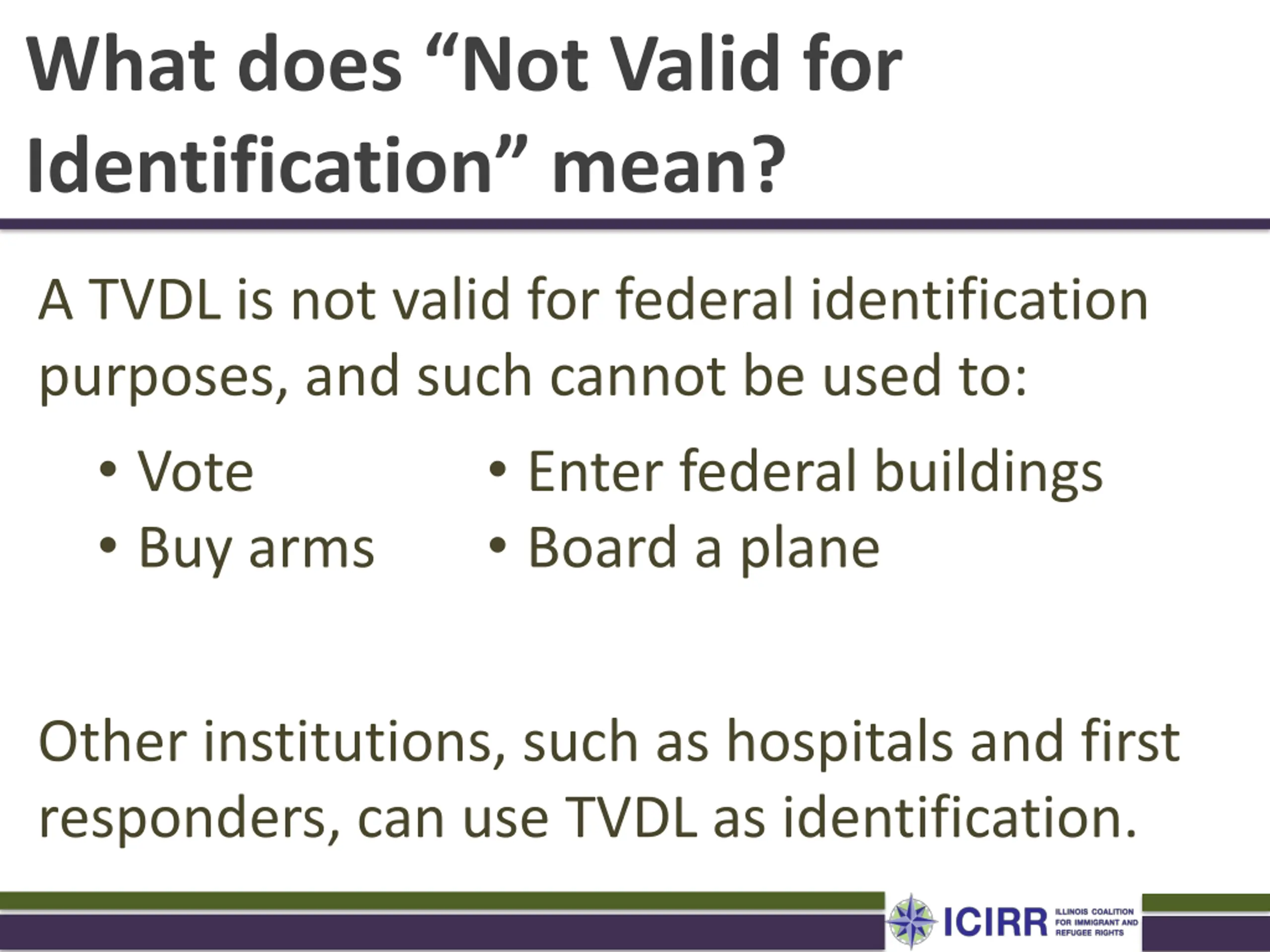 What does Not Valid for Identification mean? A TVDL is not valid for federal identification purposes, and such cannot be used to: Vote Buy arms Board a plane Enter federal buildings Other institutions, such as hospitals and first responders, can use TVDL as identification.