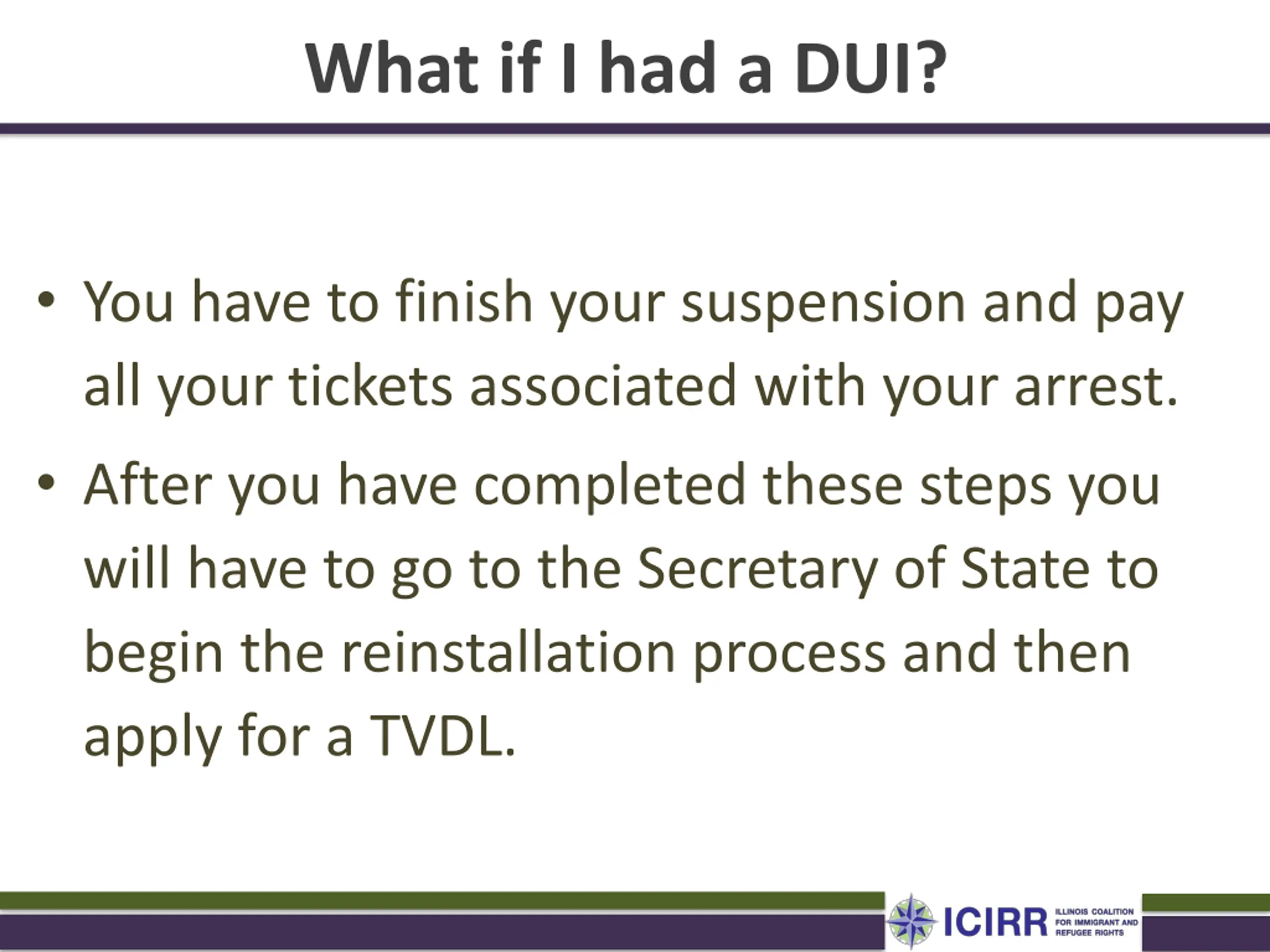 What if I had a DUI? You have to finish your suspension and pay all your tickets associated with your arrest. After you have completed these steps you will have to go to the Secretary of State to begin the reinstallation process and then apply for a TVDL.