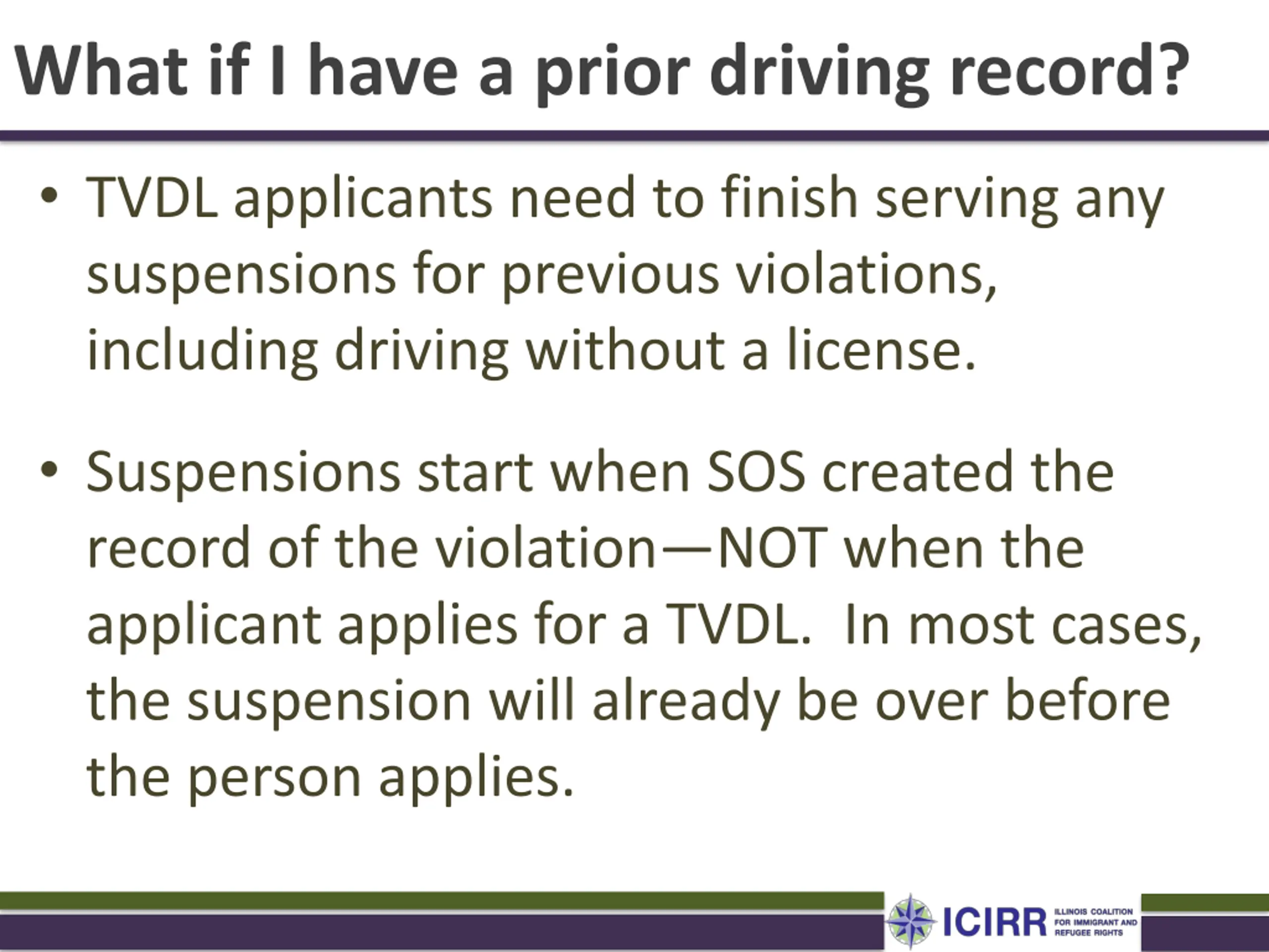 What if I have a prior driving record? TVDL applicants need to finish serving any suspensions for previous violations, including driving without a license. Suspensions start when SOS created the record of the violation NOT when the applicant applies for a TVDL. In most cases, the suspension will already be over before the person applies.