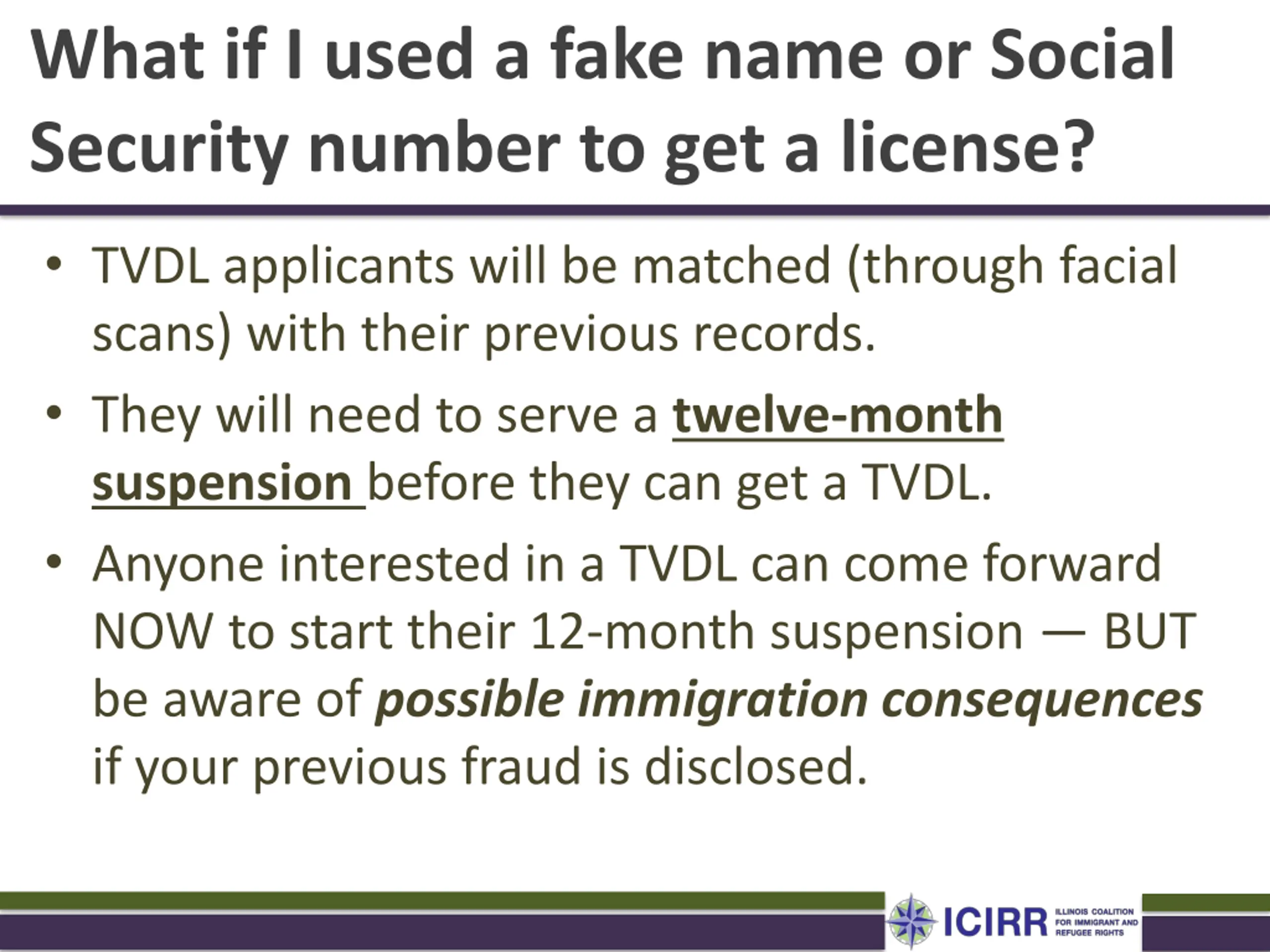 What if I used a fake name or Social Security number to get a license? TVDL applicants will be matched (through facial scans) with their previous records. They will need to serve a twelve-month suspension before they can get a TVDL. Anyone interested in a TVDL can come forward NOW to start their 12-month suspension BUT be aware of possible immigration consequences if your previous fraud is disclosed.