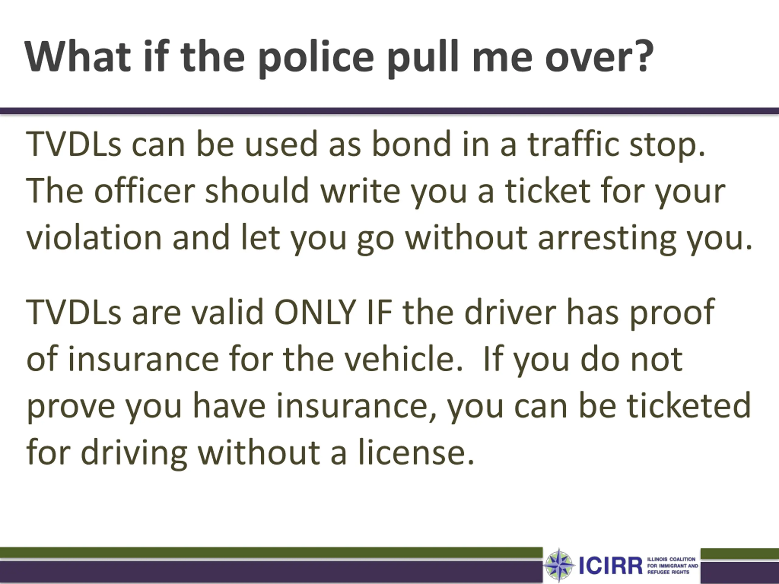 Whatif the police pull me over? TVDLs can be used as bond in a traffic stop. The officer should write you a ticket for your violation and let you go without arresting you. TVDLs are valid ONLY IF the driver has proof of insurance for the vehicle. If you do not prove you have insurance, you can be ticketed for driving without a license.