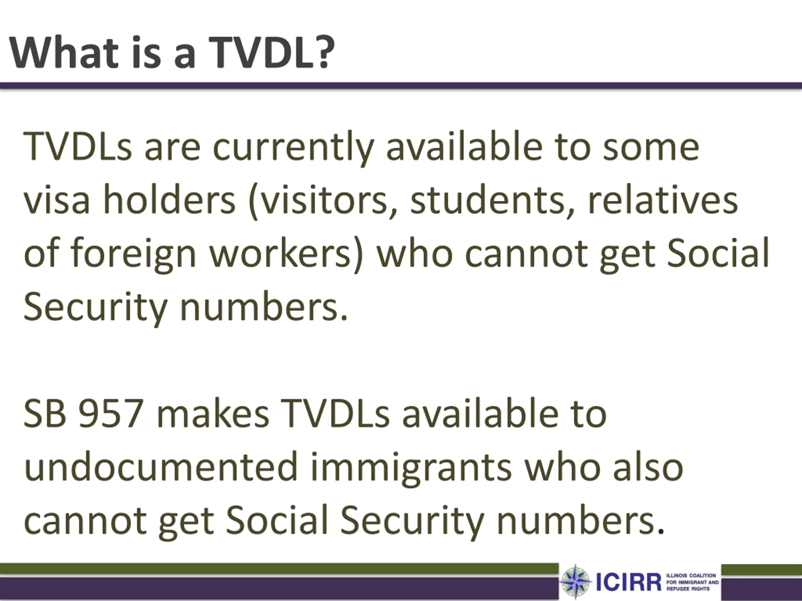 What is a TVDL? TVDLs are currently available to some visa holders (visitors, students, relatives of foreign workers) who cannot get Social Security numbers. SB 957 makes TVDLs available to undocumented immigrants who also cannot get Social Security numbers.