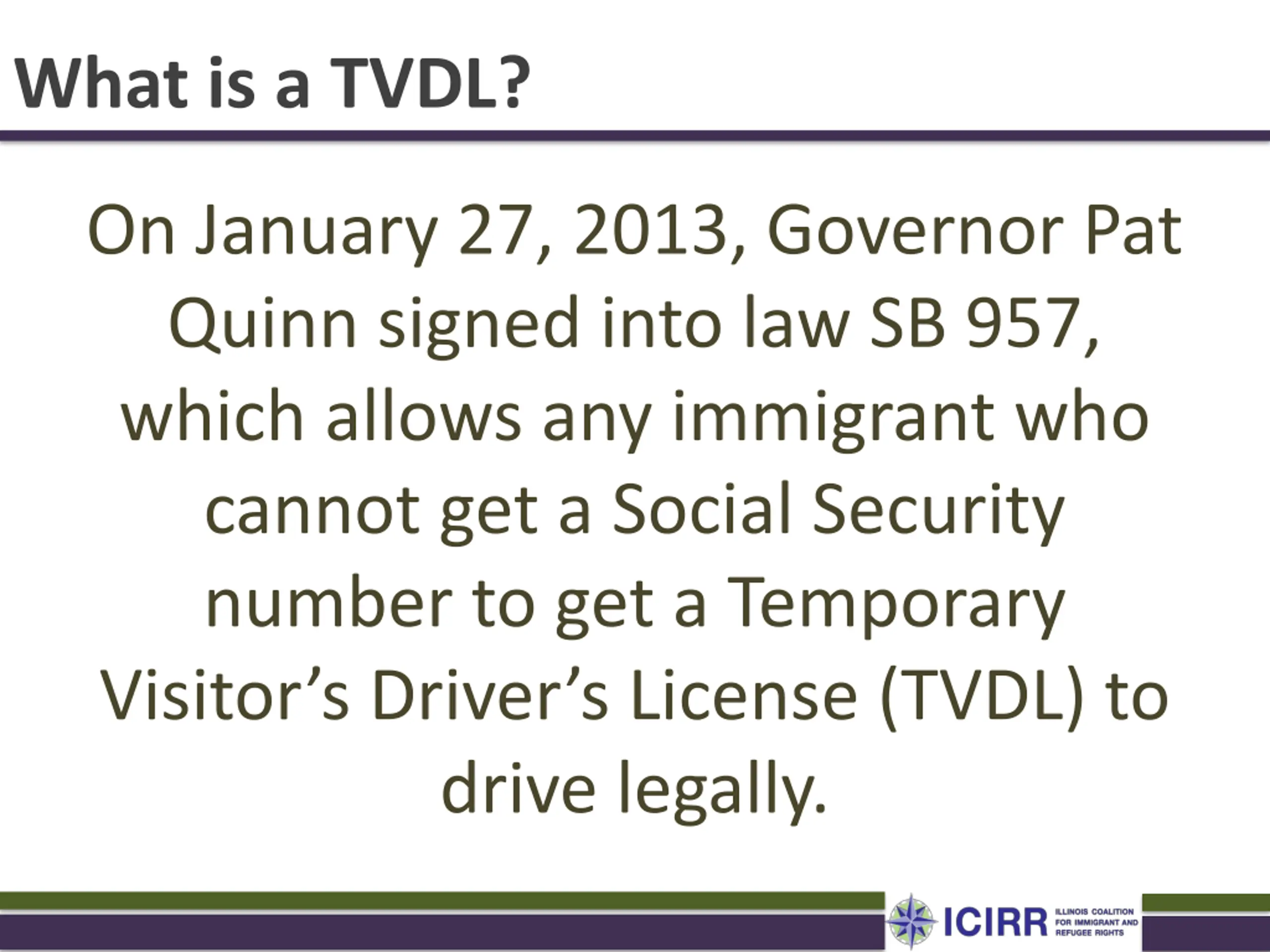 What is a TVDL? On January 27, 2013, Governor Pat Quinn signed into law SB 957, which allows any immigrant who cannot get a Social Security number to get a Temporary Visitor s Driver s License (TVDL) to drive legally.