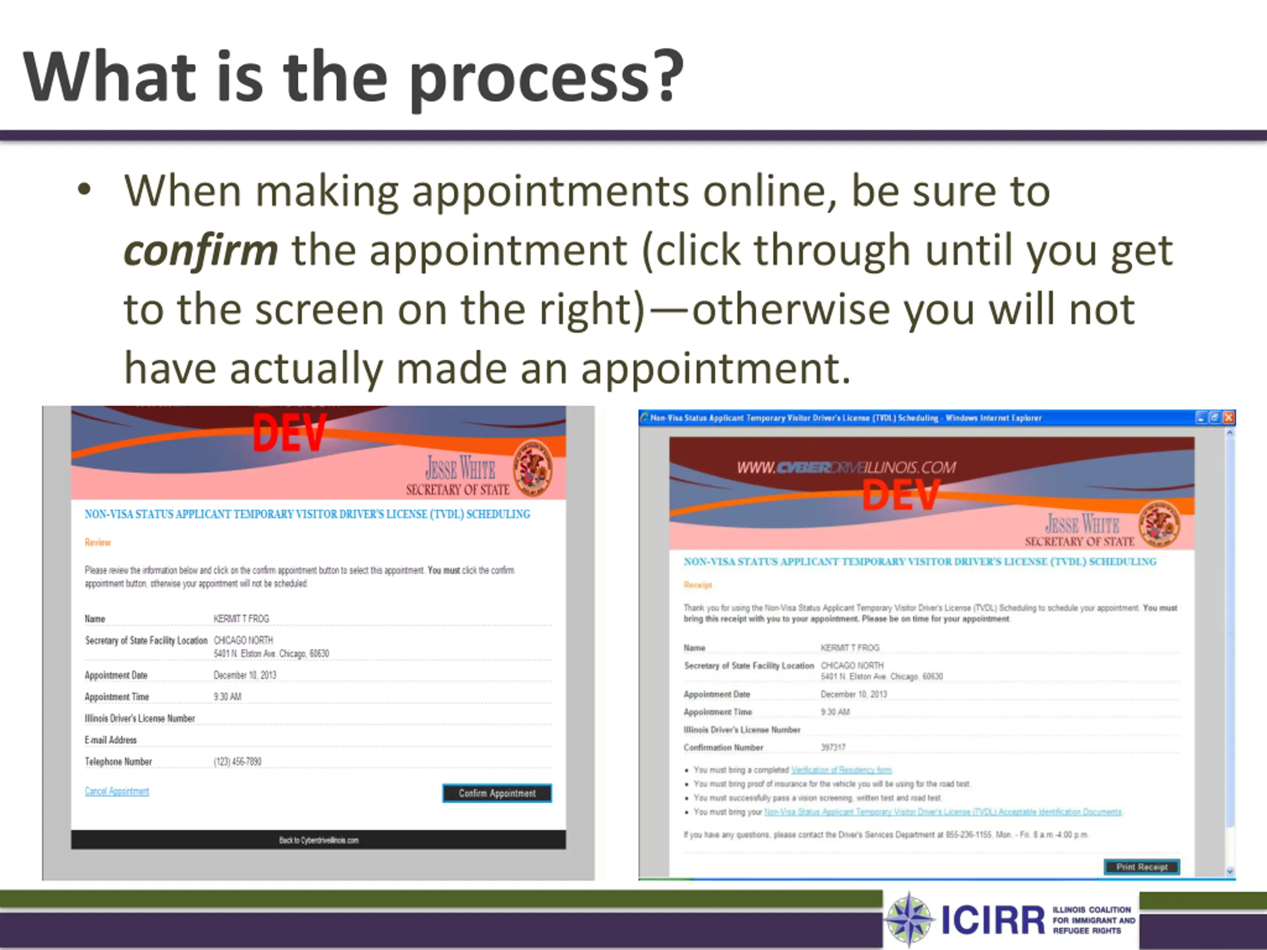 What is the process? When making appointments online, be sure to confirm the appointment (click through until you get to the screen on the right) otherwise you will not have actually made an appointment. ?