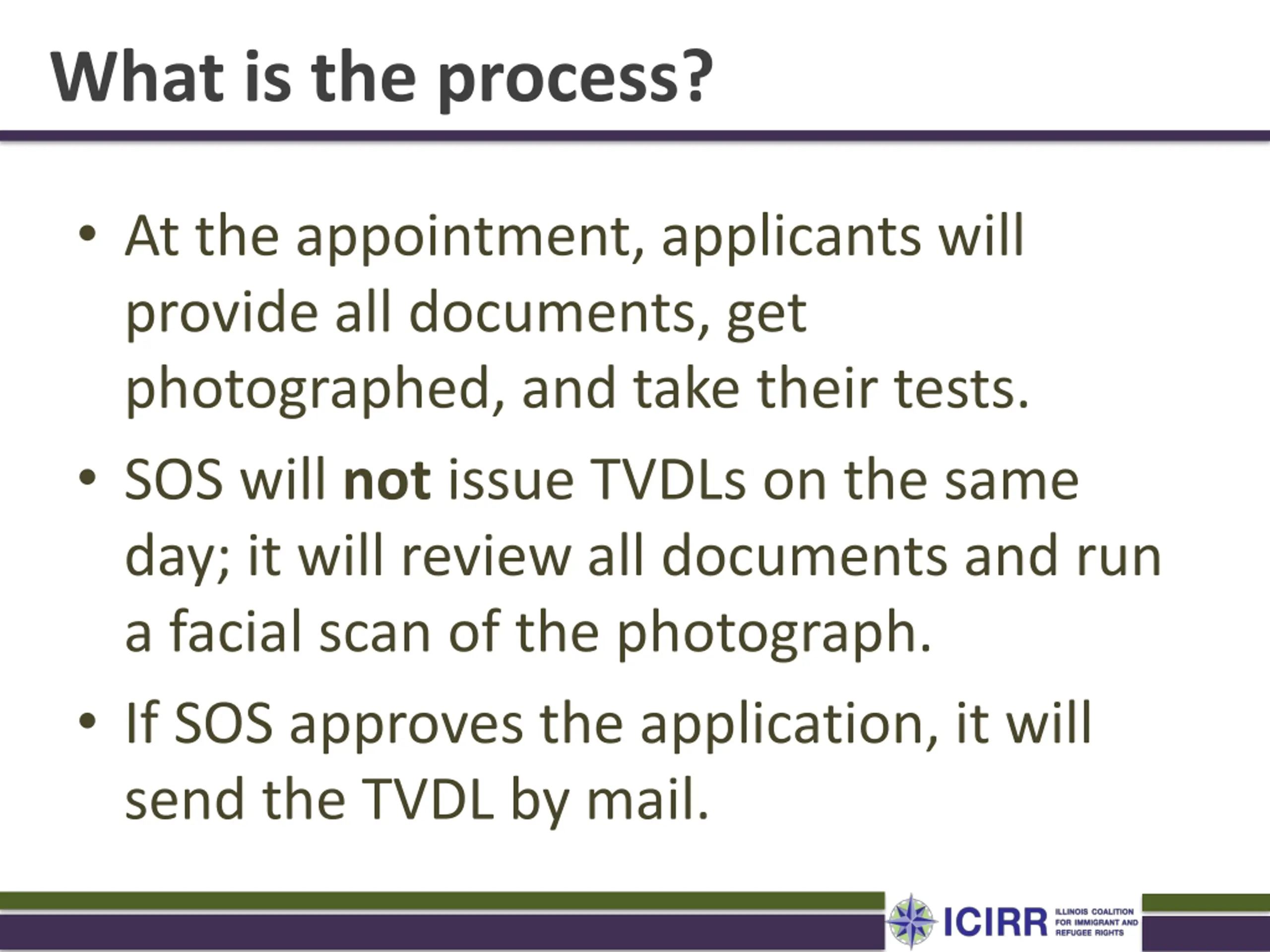 What is the process? At the appointment, applicants will provide all documents, get photographed, and take their tests. SOS will not issue TVDLs on the same day; it will review all documents and run a facial scan of the photograph. If SOS approves the application, it will send the TVDL by mail.