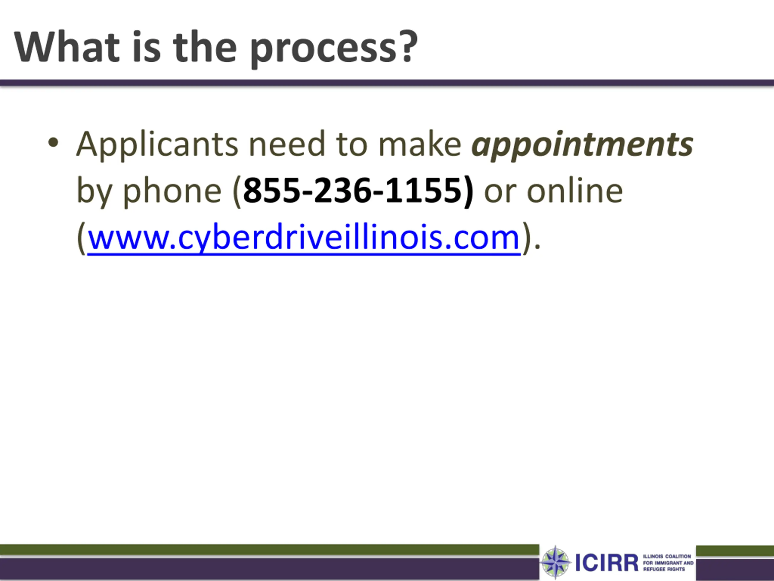 What is the process? Applicants need to make appointments by phone (855-236-1155) or online (www.cyberdriveillinois.com).