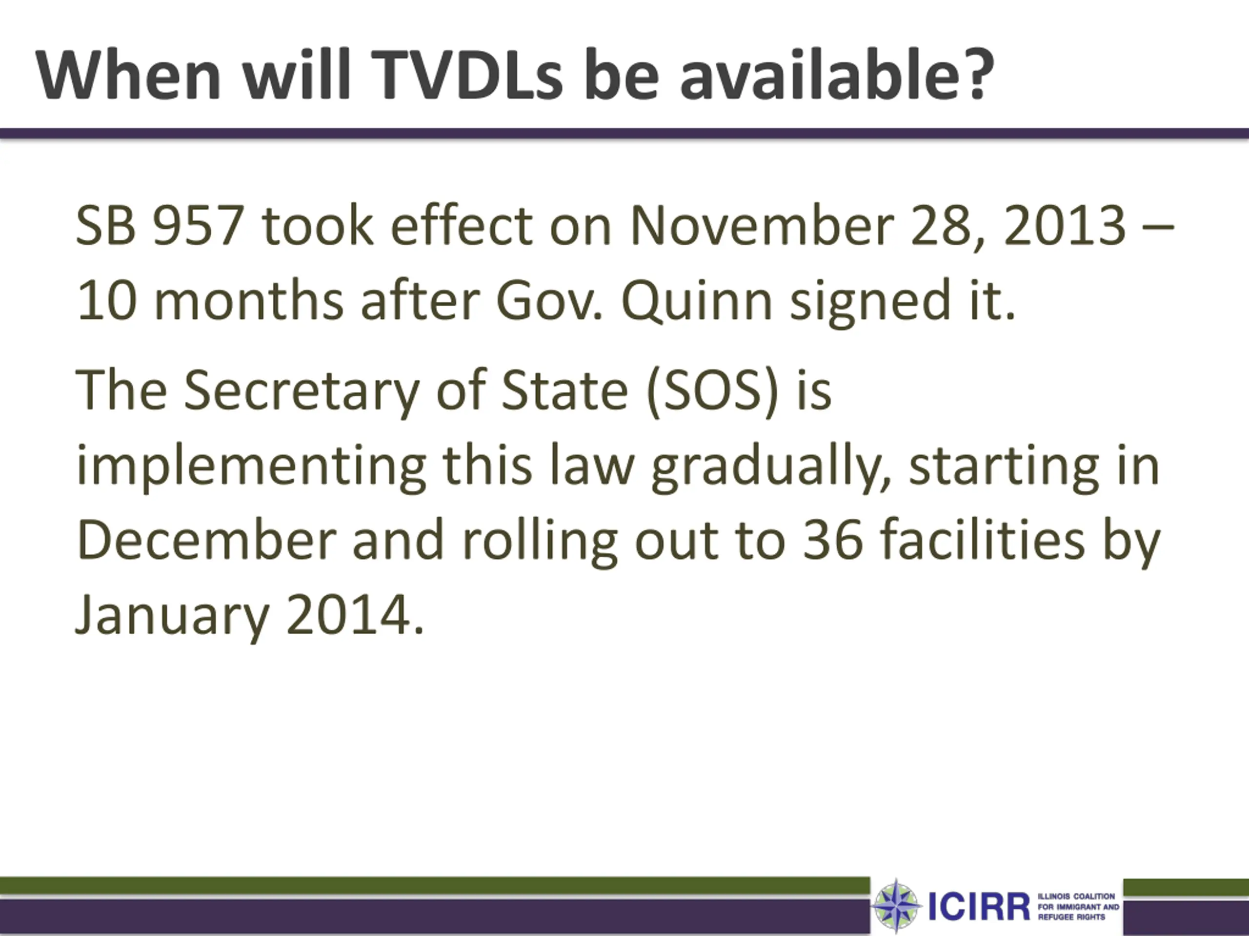 When will TVDLs be available? SB 957 took effect on November 28, 2013 10 months after Gov. Quinn signed it. The Secretary of State (SOS) is implementing this law gradually, starting in December and rolling out to 36 facilities by January 2014.