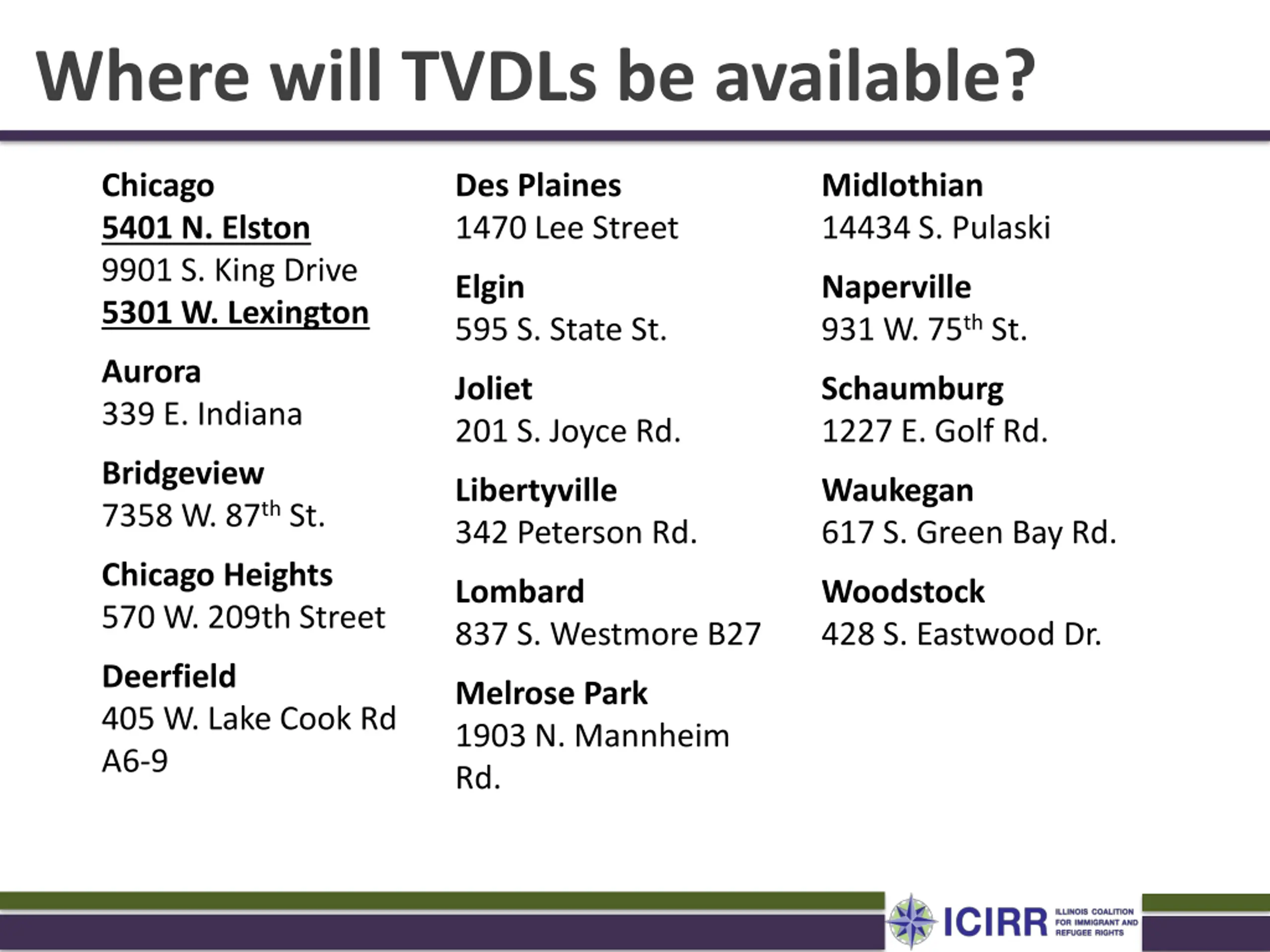 Where will TVDLs be available? Chicago 5401 N. Elston 9901 S. King Drive 5301 W. Lexington Des Plaines 1470 Lee Street Midlothian 14434 S. Pulaski Elgin 595 S. State St. Naperville 931 W. 75th St. Aurora 339 E. Indiana Joliet 201 S. Joyce Rd. Schaumburg 1227 E. Golf Rd. Bridgeview 7358 W. 87th St. Chicago Heights 570 W. 209th Street Libertyville 342 Peterson Rd. Waukegan 617 S. Green Bay Rd. Lombard 837 S. Westmore B27 Woodstock 428 S. Eastwood Dr. Deerfield 405 W. Lake Cook Rd A6-9 Melrose Park 1903 N. Mannheim Rd.