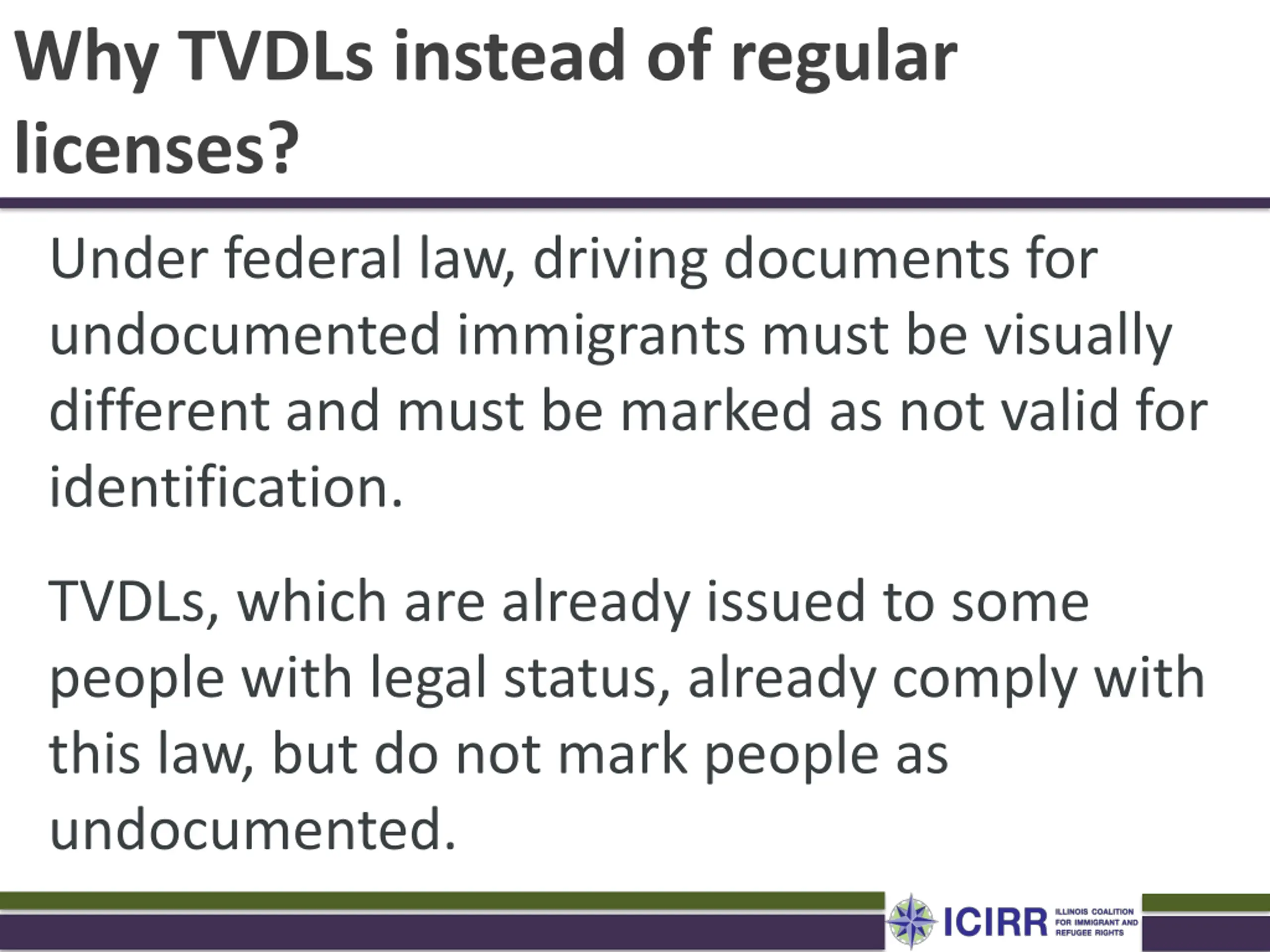 Why TVDLs instead of regular licenses? Under federal law, driving documents for undocumented immigrants must be visually different and must be marked as not valid for identification. TVDLs, which are already issued to some people with legal status, already comply with this law, but do not mark people as undocumented.