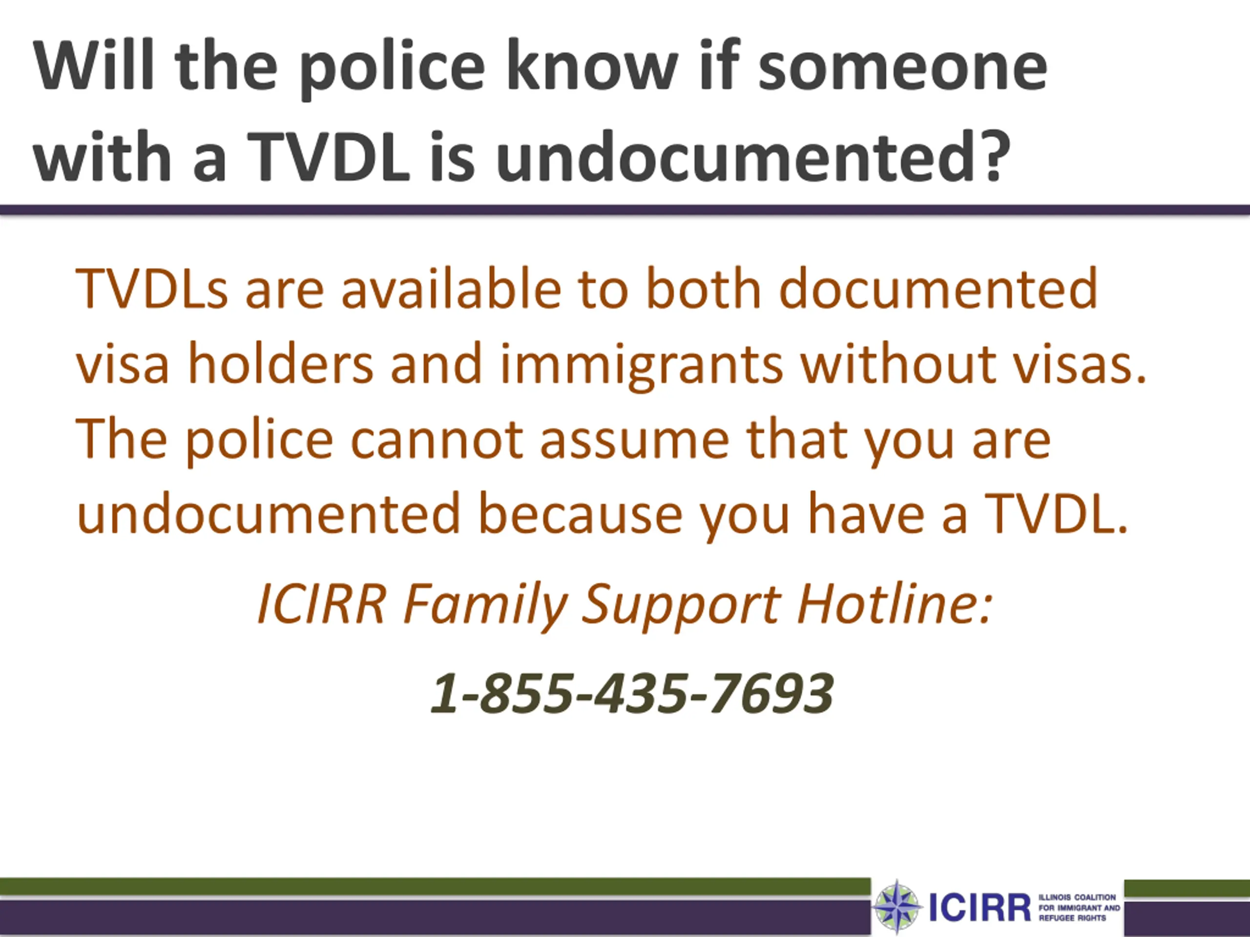 Will the police know if someone with a TVDL is undocumented? TVDLs are available to both documented visa holders and immigrants without visas. The police cannot assume that you are undocumented because you have a TVDL. ICIRR Family Support Hotline: 1-855-435-7693