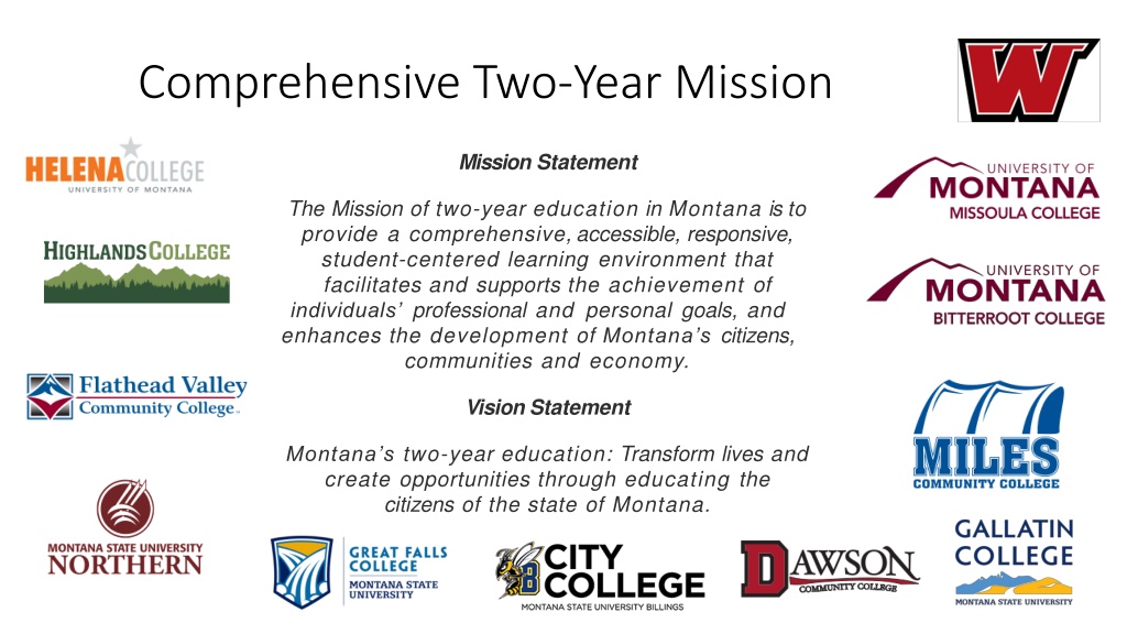 Comprehensive Two-Year Mission Mission Statement The Mission of two-year education in Montana is to provide a comprehensive, accessible, responsive, student-centered learning environment that facilitates and supports the achievement of individuals professional and personal goals, and enhances the development of Montana s citizens, communities and economy. Vision Statement Montana s two-year education: Transform lives and create opportunities through educating the citizens of the state of Montana.