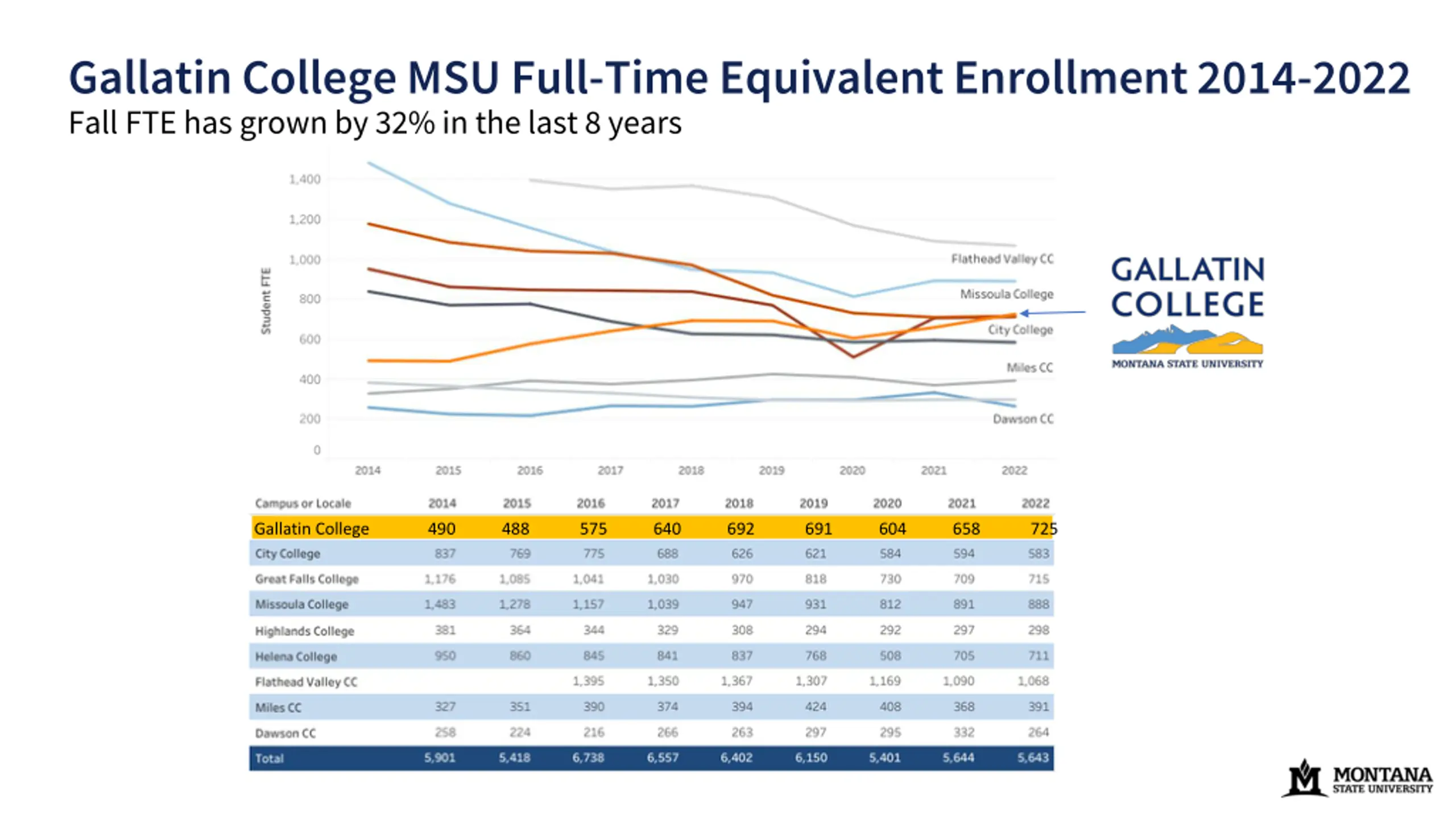 Gallatin College MSU Full-Time Equivalent Enrollment 2014-2022 Fall FTE has grown by 32% in the last 8 years Gallatin College 490 488 575 640 692 691 604 658 725