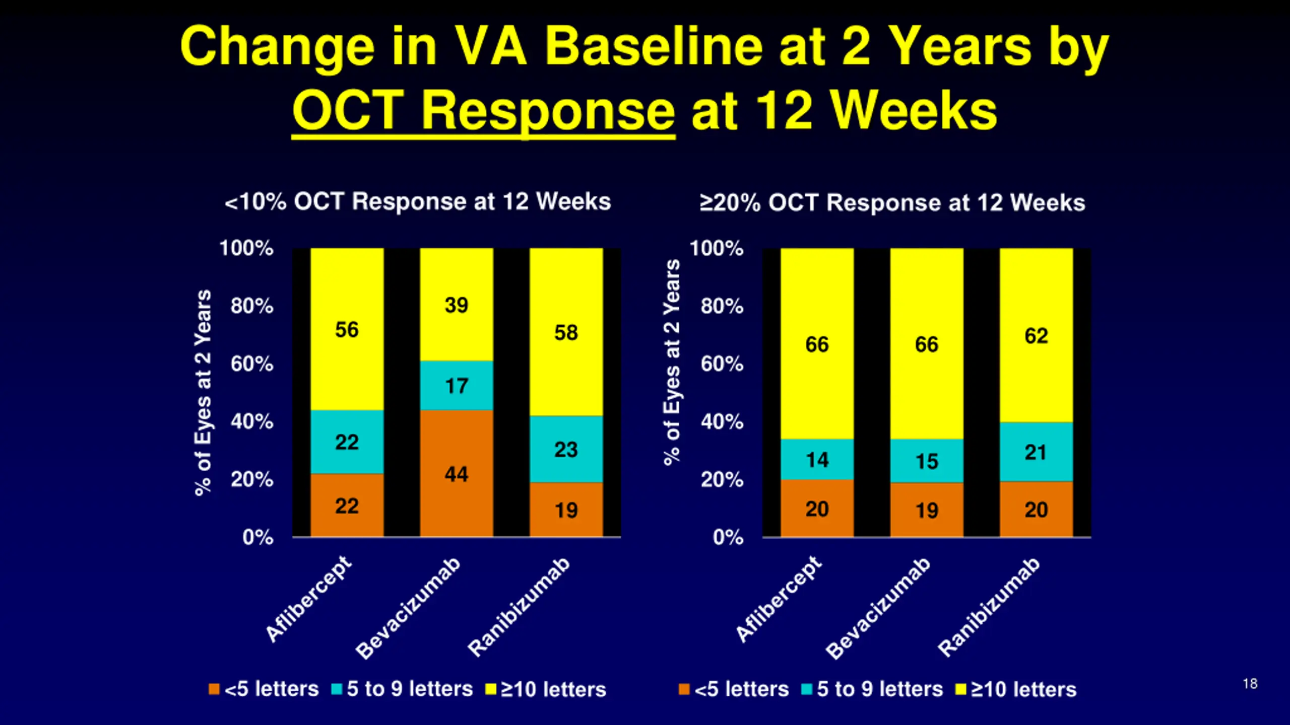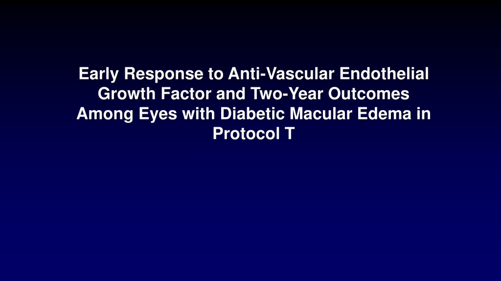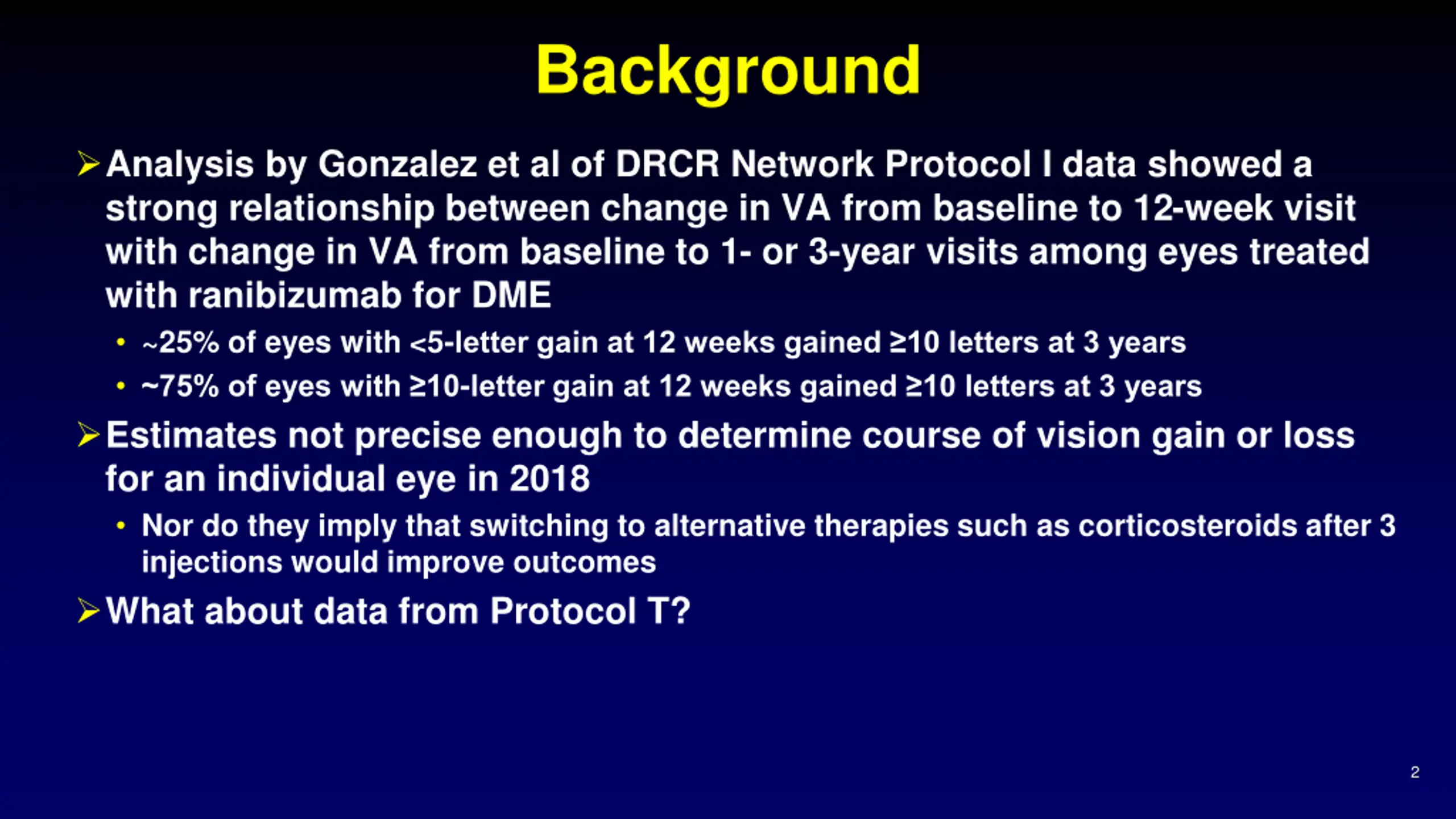 Background Analysis by Gonzalez et al of DRCR Network Protocol I data showed a strong relationship between change in VA from baseline to 12-week visit with change in VA from baseline to 1- or 3-year visits among eyes treated with ranibizumab for DME ~25% of eyes with <5-letter gain at 12 weeks gained 10 letters at 3 years ~75% of eyes with 10-letter gain at 12 weeks gained 10 letters at 3 years Estimates not precise enough to determine course of vision gain or loss for an individual eye in 2018 Nor do they imply that switching to alternative therapies such as corticosteroids after 3 injections would improve outcomes What about data from Protocol T? 2