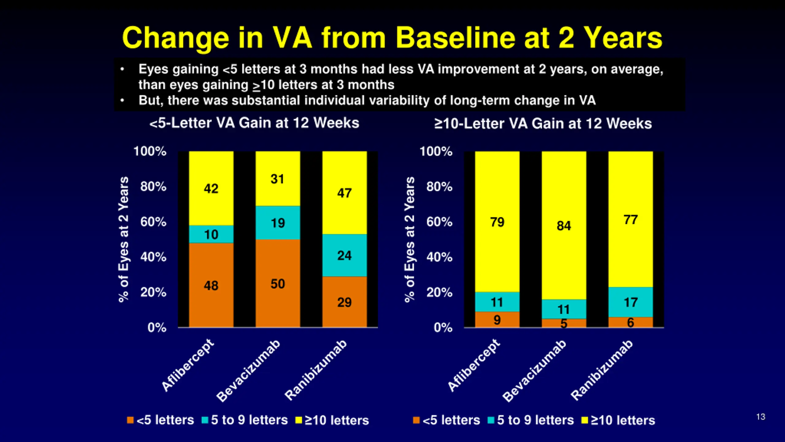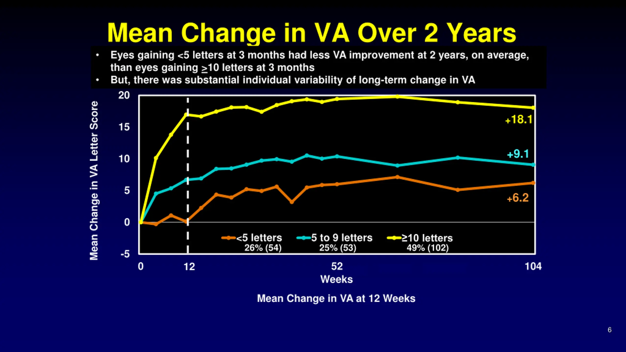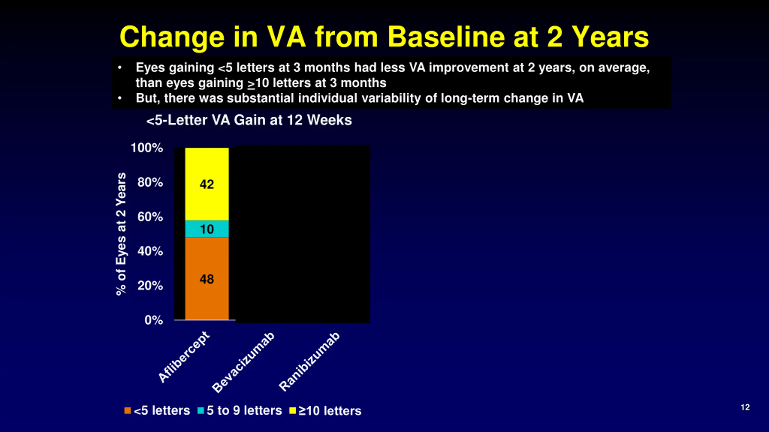 Change in VA from Baseline at 2 Years Eyes gaining <5 letters at 3 months had less VA improvement at 2 years, on average, than eyes gaining >10 letters at 3 months But, there was substantial individual variability of long-term change in VA <5-Letter VA Gain at 12 Weeks 100% 31 % of Eyes at 2 Years 80% 42 47 60% 19 10 24 40% 50 48 20% 29 0% 12 <5 letters 5 to 9 letters 10 letters