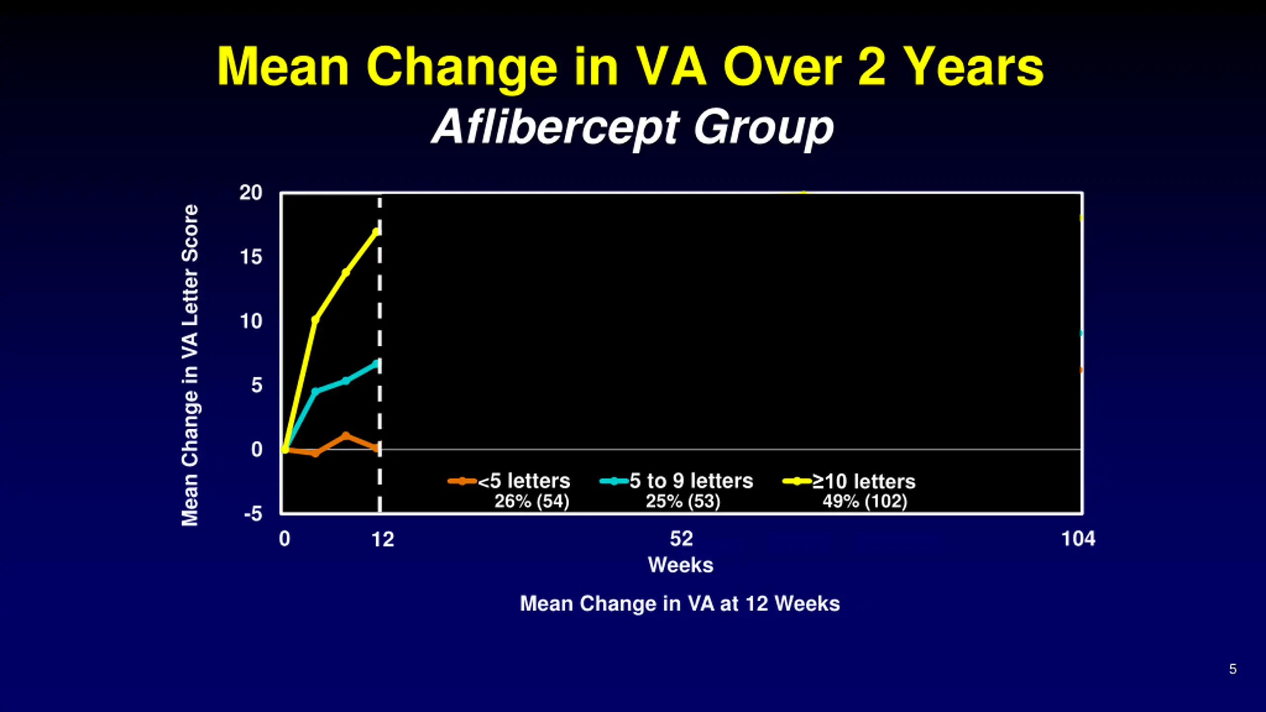 Mean Change in VA Over 2 Years Aflibercept Group 20 Mean Change in VA Letter Score 15 10 5 +6.2 0 <5 letters -5 12 0 52 104 Weeks Mean Change in VA at 12 Weeks 4