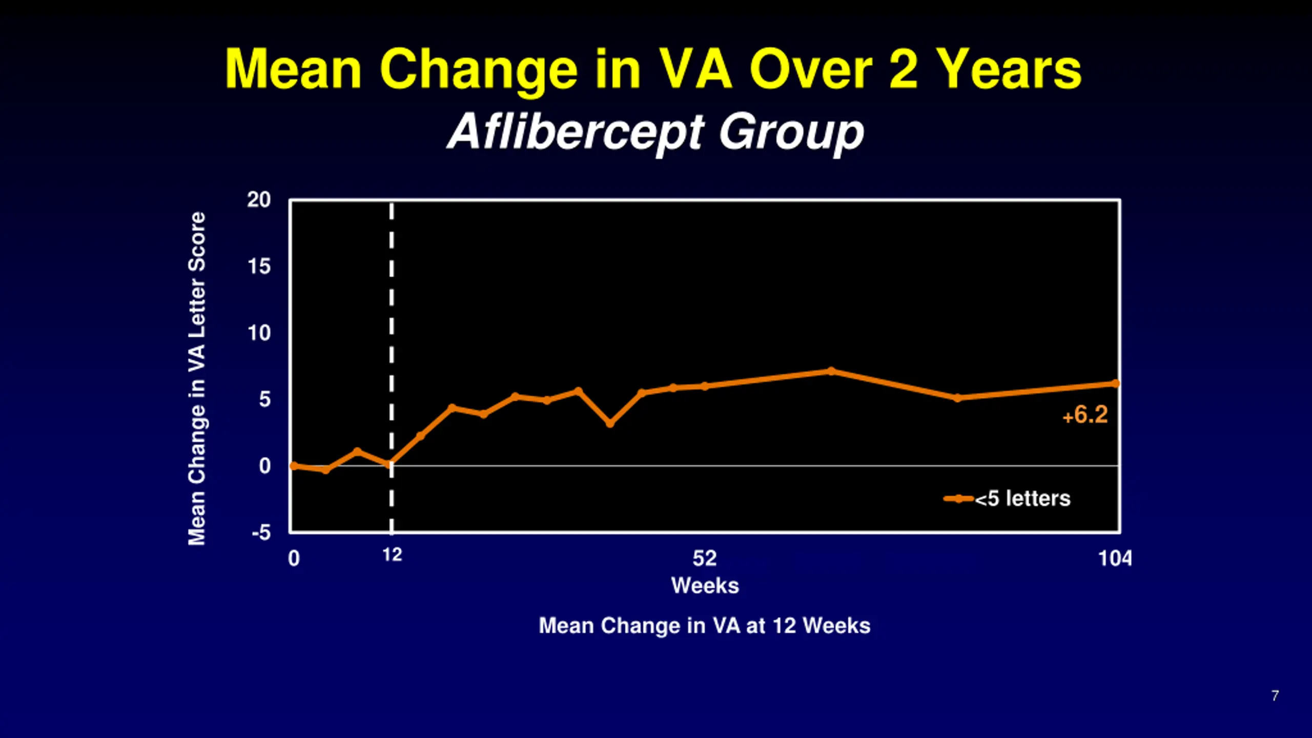 Mean Change in VA Over 2 Years Aflibercept Group than eyes gaining >10 letters at 3 months But, there was substantial individual variability of long-term change in VA Eyes gaining <5 letters at 3 months had less VA improvement at 2 years, on average, 20 Mean Change in VA Letter Score +18.1 15 +9.1 10 5 +6.2 0 <5 letters 26% (54) 25% (53) 49% (102) 5 to 9 letters 10 letters -5 0 52 104 12 Weeks Mean Change in VA at 12 Weeks 6