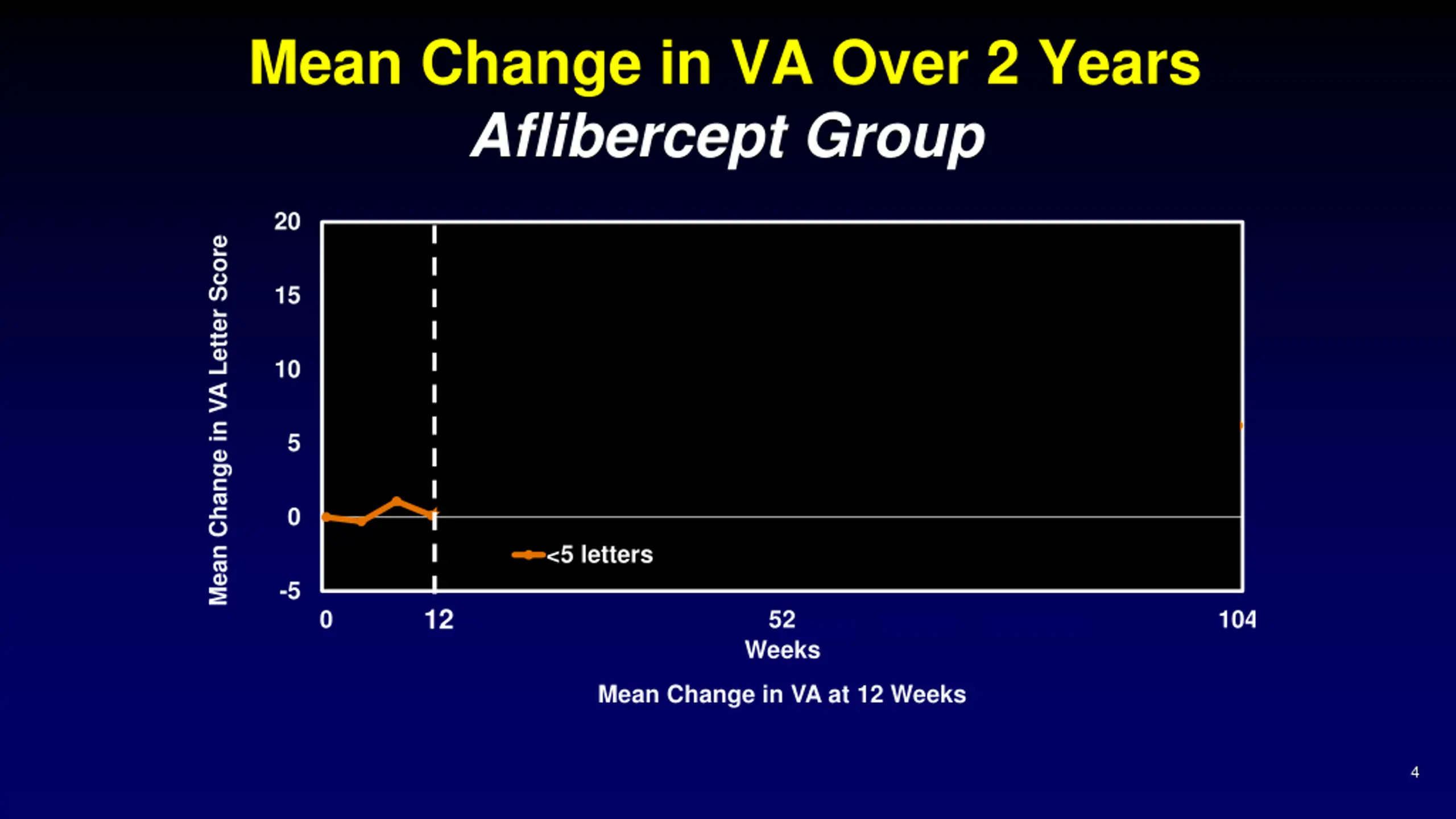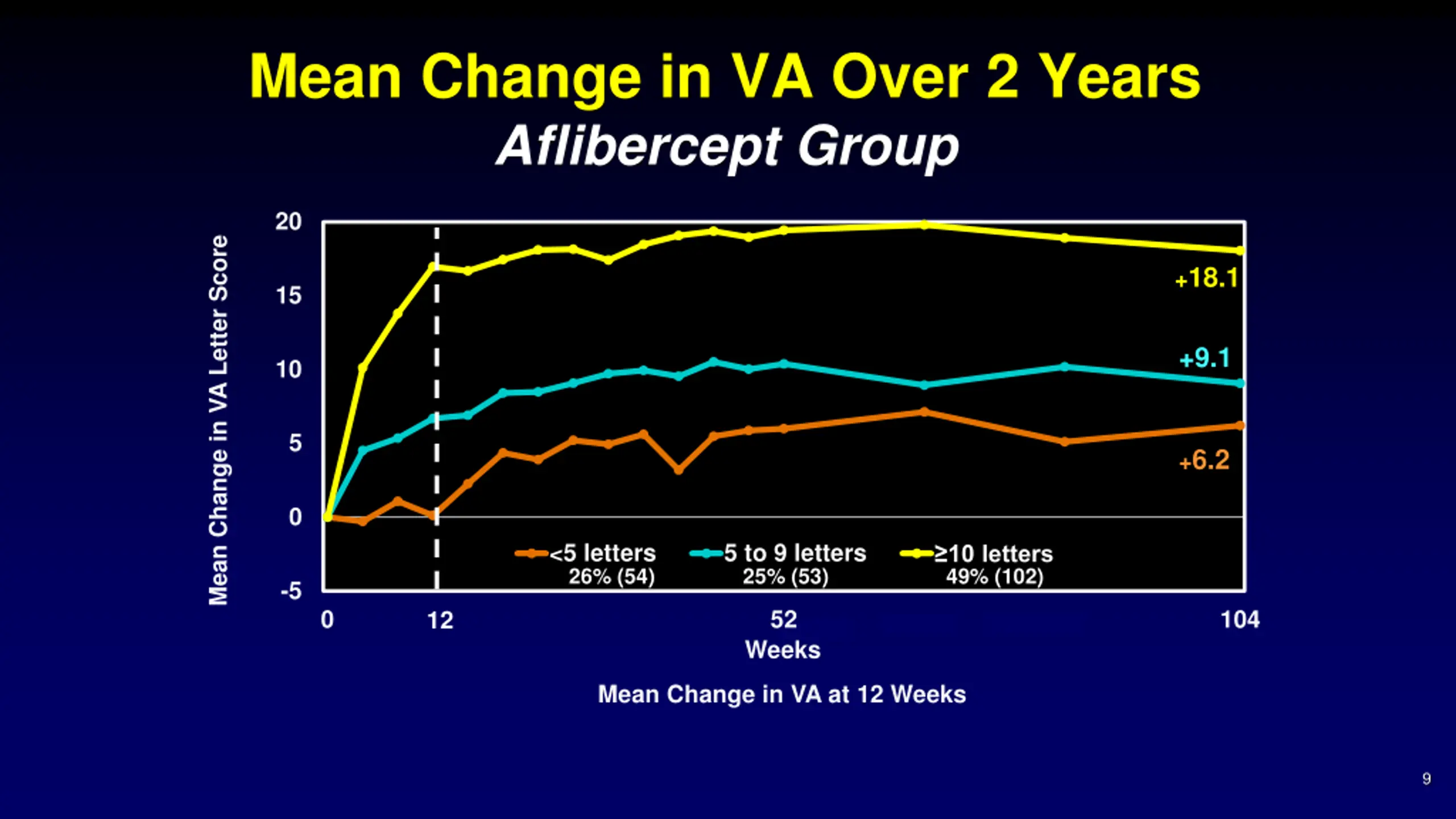 Mean Change in VA Over 2 Years Aflibercept Group Change in VA at 2-Years 20 Mean Change in VA Letter Score 15 10 5 +6.2 0 <5 letters -5 12 0 52 104 Weeks Mean Change in VA at 12 Weeks 8