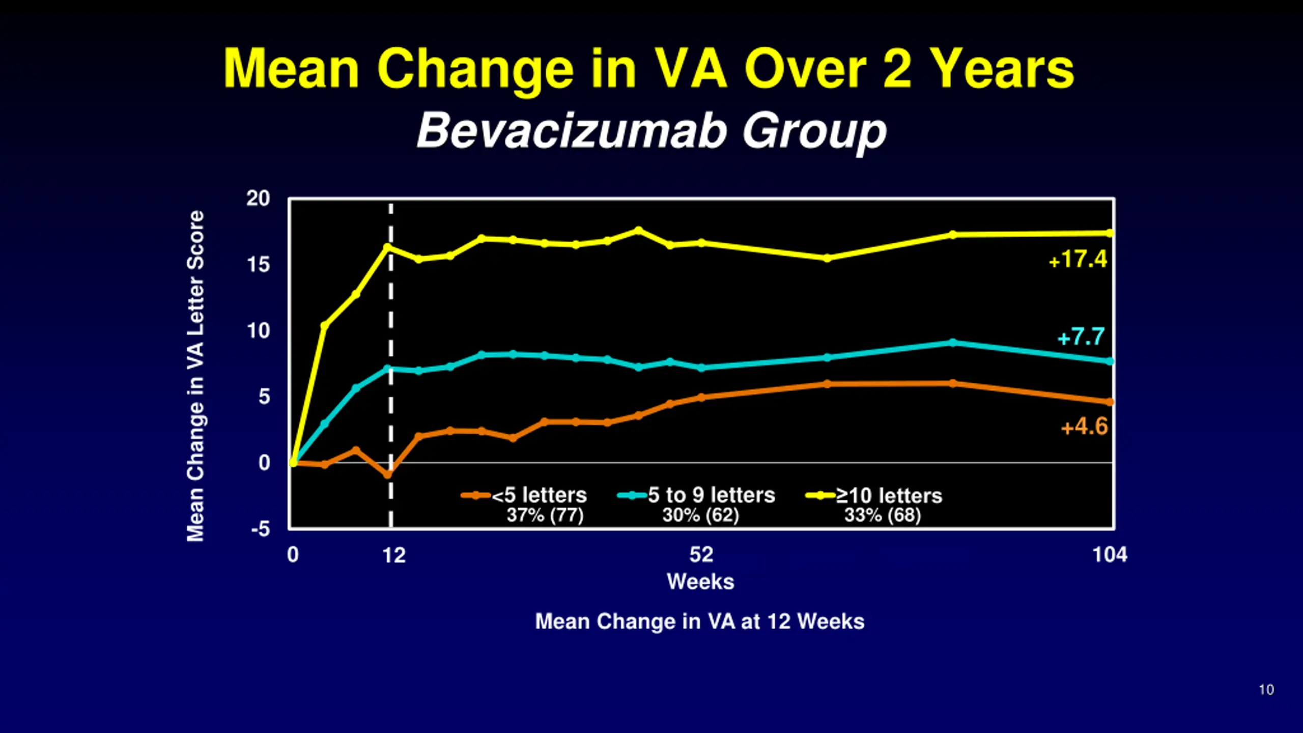 Mean Change in VA Over 2 Years Bevacizumab Group 20 Mean Change in VA Letter Score +17.4 15 10 +7.7 5 +4.6 0 <5 letters 37% (77) 30% (62) 33% (68) 5 to 9 letters 10 letters -5 0 52 104 12 Weeks Mean Change in VA at 12 Weeks 10